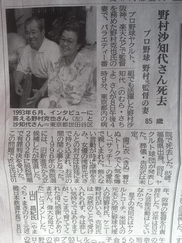プロ野球元監督の野村克也氏の妻でタレントの野村沙知代さんがお亡くなりになりました。85歳でした。ノムさんがヤクルト監督就任時から辛口コメンテーターとしてテレビ番組にも出演し「サッチー」の愛称で親しまれました。96年には衆院選に出馬するも落選。経歴詐称疑惑で告発され、さらに女優の浅香光代さんとの批判合戦によるミッチーサッチー騒動が法廷にまで持ち込まれ、世間を騒がせました。2002年に脱税問題で逮捕され有罪判決を受けるとノムさんは阪神の監督を引責辞任しました。最近はTVで見なくなったので心配してましたが、まさか亡くなるとは思いませんでした。テレビで有名な辛口コメンテーターがまた一人、天国へ旅立ちました。ご冥福をお祈りします。