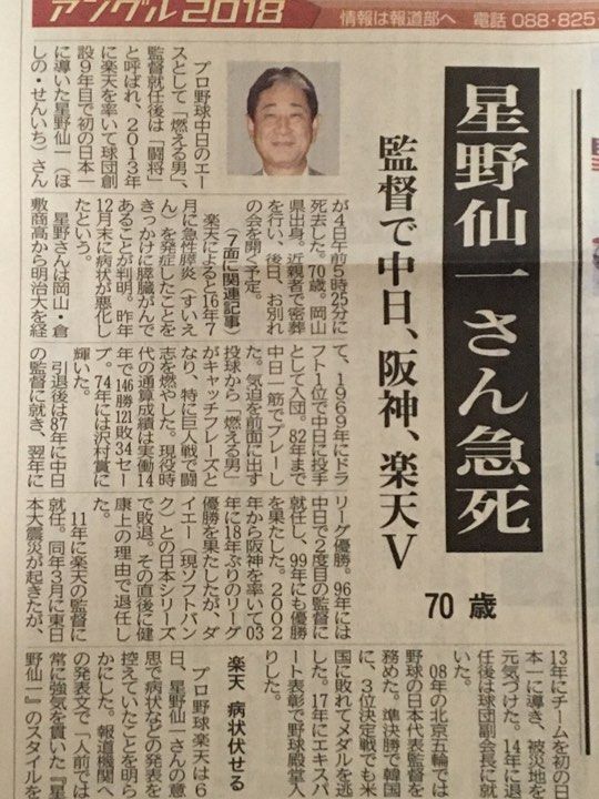今朝の訃報にびっくりしました。星野仙一さんが亡くなりました。まだ70歳という若さでした。星野さんは1969年にドラフト1位で中日に投手として入団し、82年まで中日でプレーし「燃える男」の異名をとり気迫のピッチングで通算146勝をマークし1974年には沢村賞に輝きました。引退後は1987年に中日の監督に就任し翌年にリーグ優勝を果たし、1996年に中日の2度目の監督に就任し1999年にも優勝を果たしました。2002年には阪神監督に就任し2003年には18年ぶりにリーグ優勝を果たしました。2011年には楽天監督に就任し2013年にはチームを初の日本一に導きました。私も阪神ファンだったので、星野さんは阪神ファンにとっては神様のような存在でした。監督時代は「闘将」とも呼ばれ、鉄拳制裁が名台詞でした。星野さんは「非情と愛情の2つを併せ持つ事が大事」という持論を持ち低迷していた阪神を最強の集団に作り上げました。中日で2度優勝、阪神で優勝、楽天日本一と。「弱いチームを強くする事が好き、それが男のロマンや」と反骨心の塊のような男でした。数年前には阪神の春季キャンプで高知を訪れ「縦じま」のユニフォーム姿を披露しました。ただ星野さんは酒は飲めなかったそうです。また野球界を盛り上げた名監督が一人旅立ちました。星野仙一さんのご冥福をお祈りします。