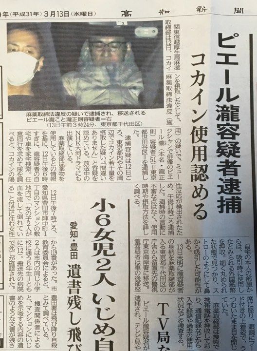 このニュースを見て、びっくりしました。俳優で電気グルーヴのピエール瀧容疑者が麻薬所持で逮捕されました。「アウトレイジ」「3丁目の夕日」の映画や、「龍馬伝」「あまちゃん」「とと姉ちゃん」「いだてん~東京オリンピック噺」のドラマに出演し、人気俳優として知られました。龍馬伝が放映された年は、NHKのよさこい中継のゲストでも来ていました。この報道を聞いた時はショックでした。この報道を受け、ピエール瀧容疑者が出演する番組やラジオは対応に追われています。電気グルーヴのツアーは中止が発表されましたし、「アナと雪の女王」も吹き替え声優が交代されるとの事です。現在の大河はいだてん噺はどうなるんでしょうか。芸能人ってどうしてこんなにクスリで逮捕される人が多いんでしょうね。クスリに一度手を染めると、やめられなくなると言いますからね。田代まさしや清水健太郎は何回逮捕されている事やら。
