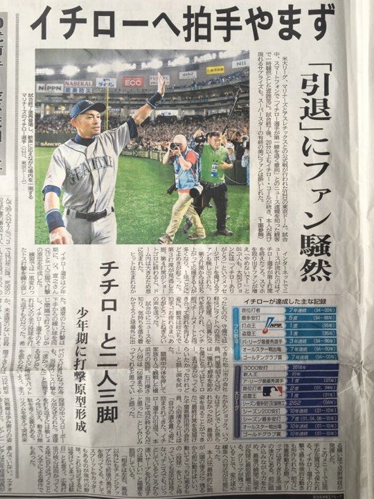 イチロー選手が昨日東京ドームで行われた2019 MGM MLB開幕戦の第2戦終了後に現役引退を表明しました。日米通算4367安打で、数々の記録を残してきた歴史に残る名選手が、平成の終わりと共にユニホームに別れを告げました。イチロー選手は愛工大名電高で投手として甲子園出場を果たし、高校卒業後の1991年、ドラフト会議で4位指名を受け、オリックスに入団しました。当時は注目選手ではありませんでしたが、1年目の92年から1軍で40試合に出場し、2年目には開幕スタメンをゲットしましたが、定位置をつかむことができずに43試合の出場に終わりました。一気に花が開いた94年、この年に仰木彬監督が登録名を「イチロー」に改名する事を提案し、日本プロ野球史上初となるシーズン200安打突破を果たすなど210安打を記録しました。独特の「振り子打法」を武器に、3割8分5厘という驚異的な数字をたたき出して、野手としてはプロ野球史上最年少でMVPに輝き、スター街道を歩み始めました。その後は7年連続首位打者に輝き、2000年にマリナーズ入りを決断しました。それまで日本人メジャーリーガーがいなかったため、メジャー入りを疑問視する声も多い中でのメジャーリーグ挑戦となりました。移籍1年目から242安打を放ち、メジャーリーグの新人最多安打記録を更新し、新人王、MVP、ゴールドクラブ賞など数多くのタイトルを獲得しました。2004年にはジョージ・シスラーのシーズン最多安打記録の257本を更新しました。この年のヒットは262本で、MLB公式サイトでも破られる事のない記録と紹介されました。2007年に41連続盗塁成功を達成し、2010年にはメジャー入りから10年連続となるシーズン200本安打も記録し、数々の伝説を作り上げていきました。2006年と2009年には日本代表の一員としてWBCに出場し、チームの先頭に立ち大会2連覇にも大きく貢献しました。しかし、2011年以降は活躍に陰りが見え始めました。10年連続200安打がストップし、2012年にはヤンキースにトレード移籍しましたが、2014年には先発を外れる機会も多くなり、衰えが見え始めました。これまで多くの記録と伝説を作り上げてきた歴史に残る名選手だったと思います。多くの若手プロ野球選手にとってはお手本となる選手だったのではないのでしょうか。私も子供の頃は一時期野球チームに所属しており、イチロー選手は憧れでした。だが私はプロには向いてないという事が分かり、野球選手になる夢を諦めました。イチロー選手は全国の野球ファンや高校球児、少年野球をしている子供達、そして野球ファンの皆さんに野球の楽しさと野球の魅力を教えてくれたと思います。大好きな野球選手でした。28年間お疲れ様でした。