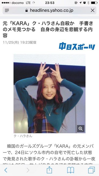 韓国の女性アイドルグループ・KARAの元メンバーのク・ハラさんが自宅で死亡しているのが見つかった事が分かりました。遺書が見つかったそうで自殺を図ったとみられます。KARAは日本でも人気を誇り数年前には紅白歌合戦への出場も果たしています。2016年に解散状態となり、ハラさんはソロで活動を続けていましたが、交際相手への暴行容疑で取り調べを受けたり、リベンジポルノで脅迫被害に遭うなど不運が続いていました。今年5月には自宅で意識不明の状態で発見され、自殺未遂と報じられました。その後は日本の芸能事務所と契約し、活動拠点を日本に移し再スタートの矢先にまさかの自殺の報道が入ってきました。暴行疑惑、リベンジポルノの被害に遭った事が原因で鬱状態になったかもしれませんね。鬱になると死にたいと思ったりする事があったと思います。私も鬱を経験した事があるのでハラさんの気持ちは分かります。前の職場でも一生懸命働いているのに上司は「勤務態度が悪い。あいつ精神障害じゃないか?」なんて言われて本当に腹が立ちました。他にも同期でサボってる奴やまともに働いてない奴もいるし。そんな奴らと一緒にされるのは嫌でたまらない。その後もパワハラに等しい仕打ちを受け、退職届を提出しました。その後は生きていてもしゃーないと思い毎日やけ酒状態に陥り半年家に引きこもっていました。再就職前には心療内科に通院したり、カウンセリングにも通いました。今も鬱の症状は快方に向かったり、逆戻りしたりの繰り返しです。命を絶つ事も考え山へロープを持って行った事もありました。その時に浮かんだのが亡くなった祖母の顔でした。その日の夜には祖母が夢枕に出てきて「死ぬなんて思うんじゃない」と一喝されました。祖母の顔も思い浮かばなければ、夢枕に出て来なければ、私は命を絶っていたかもしれません。ハラさんも生きていればいい事もあったのにね。ハラさんも悩みを多く抱えていた事だと思います。28歳、人生はまだまだこれからという途中で自ら命を絶ってしまいました。ご冥福をお祈りします。
