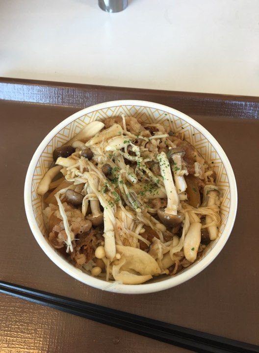 今日の昼もすき家。二日連続のすき家なんて初めてですね。野菜不足を補うためにも期間限定のきのこペペロンチーノ牛丼を頂きました。きのこは苦手ですが、ペペロンチーノ風に味付けされていたので美味しく頂く事ができました。すき家の期間限定メニューが出ると必ず食べたくなるんですよね。私の嫌いな食べ物でない限り(笑)。