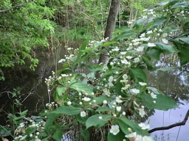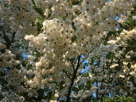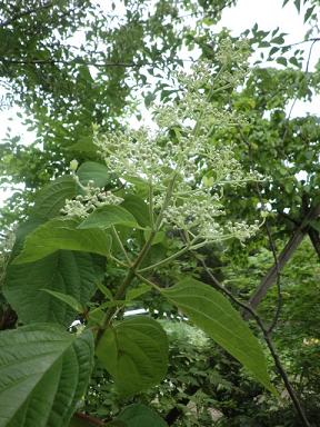 我が家に10数本あるエゴノキの内の一本です。私の場合、こうした雑木の剪定には、切り詰め剪定は絶対にしません。人工的な樹形になるのと、行き場を失う栄養分により、切り詰めた所に枝がいっぱい出てきて樹形を崩し、その後の手入れが大変になるからです。切り詰めの代わりに、伸びすぎた枝を残す枝の所で切り、次の枝を残しながら木をコンパクトにしていきます。3年に一度くらいに鋏を入れてきたエゴノキですが、剪定をする対象の花木には肥料は控えるかやらないことにしています。落ち葉がこのような場合にも最良の肥料だと思っています。化成肥料も、単肥料を購入してNPKの配合を対象植物ごとに変えて与えます。有機物肥料が主で、化成肥料を従にして与えています。ガマズミと別のエゴノキ様子(上とは違うもの)です。手前が別のガマズミで、中と奥がヤマボウシの花です。花と苞がどうのこうのは見た目だけでの表現なのでご了承ください。ミツパの保護群落です。草刈が主な管理上、こうして種を保護していきます。此処では此のミツバが優位にありますが、こうして保護して種を付けさせます。此の種を運ぶものの力を借りてあちらこちらに拡大していくことになります。イトヒキソウの保護群落です。種が衣服にくっつくので私は嫌いなのですが、何故か妻が好きなので、その命令により守られいる幸運な植物です。蕗の保護群落です。わざわざ保護しなくても、不思議なことにいつの間にか勢いを増している、強健な雑草でもありますが、我が家では手軽に取れる食料になります。年中同じ所で収穫していると、秋まで柔らかい蕗を食べられるのです。ただその場合、毎年場所を変えることが必要になります。此方で「ミズ」と呼んでいるウワバミソウの保護群落です。あちらこちらにこうした保護群落がありますが ,此処のはやっと根付いた所のものです。これも食料として利用する目的で保護をしていますが、此方は蕗と違い山野草としてもそこそこ見られます。今日の最後は、またモリアオガエルの産卵の様子です。コロリィリィリィと涼しげな鳴き声が凄かったので今朝見回りをしたところ、あるある凄い数です。まだ鳴いているので、今晩も産卵するのかな?と楽しみが増えました。その一部を紹介いたします。ヤブデマリに産卵していました。大きな卵隗なので、複数のカップルのものだと思います。此処には卵隗が3個ありましたが、それ以上の数のカップルによる産卵が展開されたようです。産卵が終わらず朝になってしまったカップルたちで、メス1に雄4の何とか状態になっていました。こうして増えてもらうと、色々保護した甲斐があるというものです。