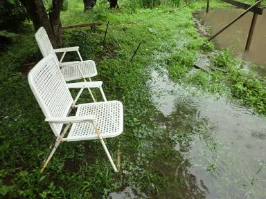 いつもお茶などを頂いている所も水が溢れてきました。キョウカノコのところにある排水路もこんな調子で勢い良く流れています。こちらでカナヘビと呼んでいるトカゲさんです。ちょろちょろと素早く動くので撮影は慎重にしました。昨日は記録的な雨と聞いていますが、此処は記録的な降雨とはいかなかったのですが結構の雨量に驚いています。