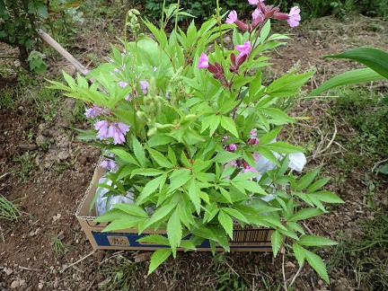 ジャーマンアイリス咲き揃ってきました。特別な肥料や管理をしなくてもこうして咲いてくれるありがたい花です。野鼠にも食べられることが無い様で大変に助かります。グラジオラスは堀上をしないで置いたら50%ぐらい食べられてなくなっていました。傍に水仙を植えるといいと聞きましたがそうなのでしょうか?どなたか良い方法があれば教えてください。山野草の草むしりをしていたら、コブシの実生を見つけて此処は邪魔なので畑に移植をしました。こうして植えて支柱を立てて置きます。苗の固定の為ではなく、草刈機で刈らないようにするための目印の役割を果たします。今日は同じ場所に3本あったので3本とも移植をしました。クリンソウですが前に紹介して有る株とは花の色が違います。穴ぼこにして植えつけてあります。肥料は好きなようでやると大きく育ってくれます。これも以前紹介した野村モミジの実生です。藤の株と抱き合わせになっているので良く解りませんが、葉色も変化して綺麗なモミジです。これも上の畑に移動です。大盃の古株です。40年位前に此処に移植をして太らせておいたのですが、仕立て方わからないので鉢上げはしたものの処置に困っています。このままでは弱るのでまた畑で養生です。ほったらかしにしているのがわかるでしょう。精力が感じられなくなってきています。