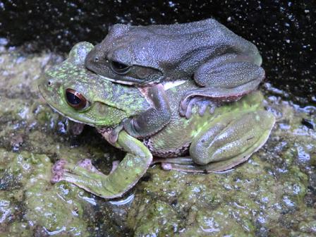 モリアオガエルが産卵している、稚魚池に突き出している桑の木での物語です。気持ち悪い画像ですみませんが、産卵中のモリアオガエルを狙って桑の木にいる木登りの得意なシマヘビ君です。胴体の一部です。蛇から逃げてそれを見上げているモリアオガエル君です。こちらも同じくオスを背負ったまま逃げてきて蛇を警戒しているカップルですが、オスはこんな緊迫した状態の時にでも雌から離れない執念には可笑しさを感じますね。こちらは卵隗の泡をつけたまま池に逃げ込んできた雄の蛙君とメスのカップルたちです。こういう光景なのですが、3年前に無農薬のおコメを試作した時に、数個の卵を産みつけたのが始まりでした。僅か3年目にしてかなり増殖しているようで、正確には数えていませんが今現在までに我が家の敷地内に産み付けられたモリアオガエルの卵は100個に届きそうな勢いです。あまり増えると鯉の天敵にもなりかねない存在に複雑な思いもするこの頃です。今日は花は後で追加しますが、今朝の鯉の産卵の様子です。雄3匹入れたのですが、頑張っているのは一匹だけでした。産み付けられた卵の一部です。雌が大きいので産卵量が多かったようです。雨でしだれているヤマボウシです。今年は珍しい光景になりました。