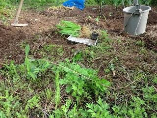 今回ヒウオギの苗を植える場所を荒地に作る自己流方を紹介いたします。今回の予定地の作業前の状態です。此の柄を短く改造した鍬で、土の表面を草の根ごと削り取って行きます。作業が終わった状態です。予定の広さより大きめに削り取るのがコツです。削り取った草の根とそれに混じった土はそのまま積んでおいて草を殺すか、穴を掘って土をかけておきます。後で自然の培土が出来ます。ミミズと土の中のバクテリアによってほとんどの草の根は死んでしまいます。土作りの相棒です。土の中に草などを鋤きこむ事で増えていきます。次に鍬を土に薄くかけて耕します。決して大きく耕さないで薄く耕すのが基本です。力を入れて腰を痛めたりしないように腕と鍬の重量を利用して、決して腰を使ったような作業はしないことです。下半身特に膝を上手く使うことが腰を痛めないで長く作業をするコツになります。次に耕した周りを耕しながら中に盛って行きます。盛った土を鍬で均して植え床を作ります。植え床に植え穴を桑で掘ります。此の植え穴に、壷水と呼んでいる水を多めに入れて植えつけます。植えつけてからやる水の量より遥かに少ない量で最大の効果を期待できます。植えつけて周りの土を再度土寄せをして終わりです。これで1m×1mのヒオウギの花畑が10分もかからずに作ることが出来ました。此の柄を短く改造した鍬は、振り子の原理を畑作りに利用でき、疲れずに荒地を整備できます。最も皆さんは綺麗にしている所に花壇などを作るので参考にはならないと思いますが、私の場合には此のやり方で、畑を徐々に拡大していくことが簡単に出来ていくようです。この方法で開拓した荒地の様子です。管理の基本は、草刈によるので、何度も刈られる所には野性の芝生が自然に構成されていきます。草刈による管理地と栽培地の管理の境の草の進入を防ぐ方法は鍬による植え床への土寄せで対応するのが一番よいようです。くれぐれも作業で腰を動かすようなことをしなくても出来るように体得してください。作業楽になります。今日の朝取りイチゴです。草に呑まれて消えていたと思っていたので、思いがけないご馳走になります。我が家の玄関の中です。書は家の母のいとこが書いたもので、母のいとこには書道家が多いのです。家の家内もやっていますが、家内の性格上しまいこんで決して人前に飾ることはしません。ただ花を飾りつけることは好きなので家のいたるところに切花が飾られています。此の花瓶は地元の作陶家の方の作品です。この方の作品は釉薬に自然の材料を使われているので、新しい作品でも時代がかった古色に仕上がるのがよい所だと思っています。