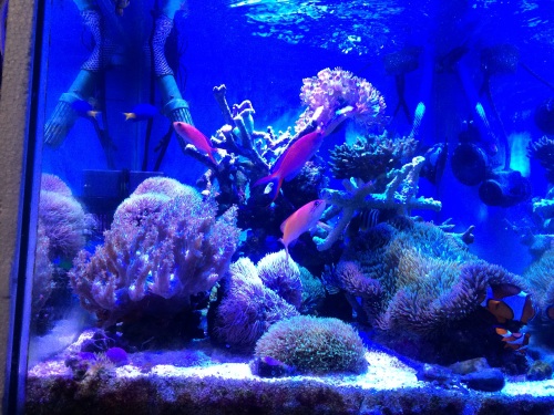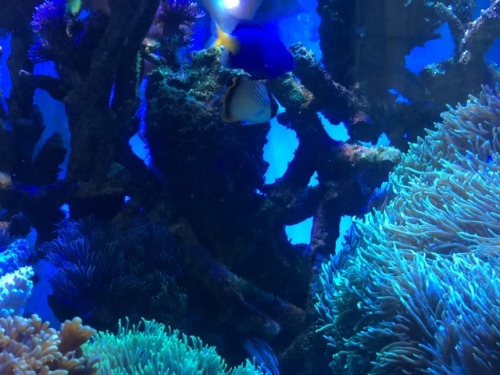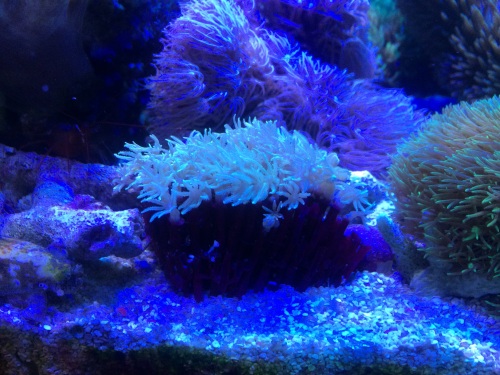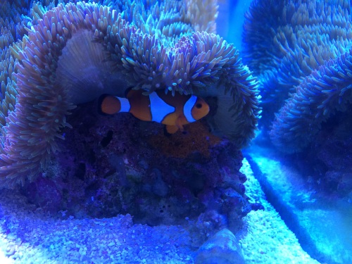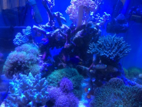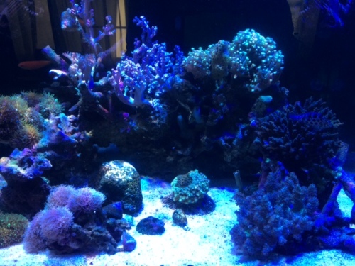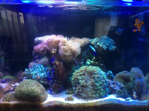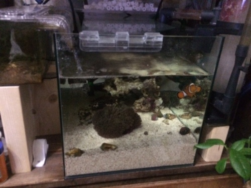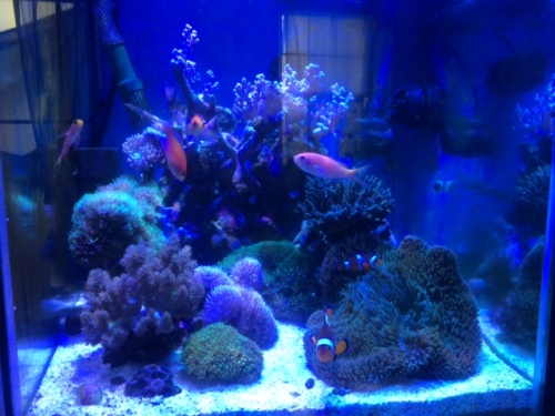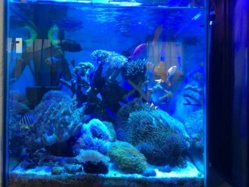現状の海水水槽は・・・。上に60ワイドのサンゴ?水槽で、下に45規格のニモ水槽を連結させてました。。。が~、夏の崩壊後、サンゴもいくつかダメになり。。かなり隙間が出来るような状況でした。。。海水はウツボ水槽が追加されてて、何気に先月の電気代の請求書を見て。。こりゃぁ~まずいなぁ~と(笑)去年の同時期より確実に上がってるわけで~。。。まぁ生体も少ないし、マメスナやスタポの強いサンゴをウツボ水槽にいくつか移動し、統合することしました。。。で~出来上がりがこちら。。。45センチキューブですね。ちょっと前にニモ水槽を縮小した時に余ってたやつを使用しました。。バイオペレットは外してしまって、間欠底面フィルター&プロスキだけの、半ベルリンですね。。で、バイオペレット替わり?というか、前から添加してますが、レッドシーのNO3PO4を添加して、炭素源を加えてる感じですね。シンプルシステムです(笑)まぁ~コンパクトにまとまりましたね。ハタゴが何気に大きくなってる感じがしますが。。他のサンゴに接触もないですし、ニモとハナゴイも問題なさそうなんで、これでいこうと思います。。。皆さんが魚を増やしてるのを見ると、羨ましい限りですが(笑)今の水槽ではそこまで魚は入れられないので~我慢ですね。ちなみに・・・チンアナゴが脱走して☆になってしまいました。。。何でも食べるようになってて、長期いけそうだったのに残念です。。。というか・・・あの隙間から出るとは。。。