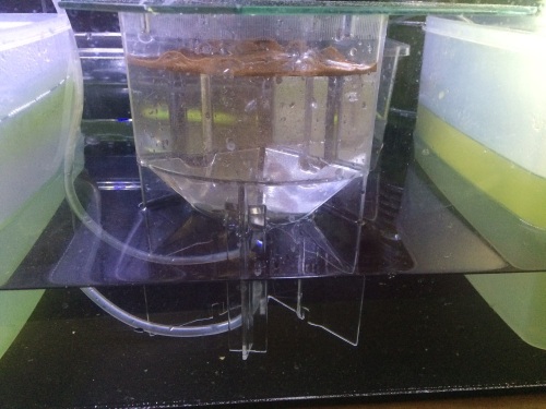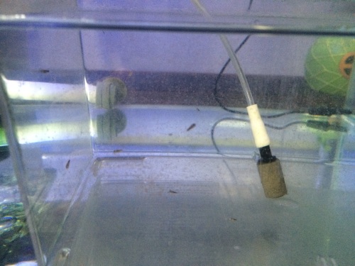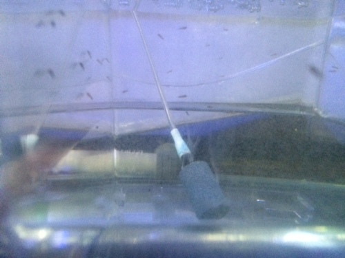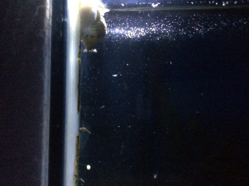 さてカクレクマノミが産卵してから、1週間以上たったので、そろそろ孵化するのか??と思い始めた土曜日。。。卵の数は本当に両手で数えられるくらいに減ってしまいましたが、相変わらず、親はせっせと卵の世話をしていました。卵も中の稚魚の目玉が見えるくらいになってて、もう産まれるだろう。。。ということで、色々準備したんです。。ワムシを日海センターで購入したものを培養しつつ、親にも栄養をとブラインをわかしたり。。。稚魚にヒーターを付けない様に、水槽の中にプラケースを設置して、そのプラケースで飼育できるようにもしてありました。。ただ、水温がそこまで高く設定してないせいか?土曜日の夜も・・・日曜日の夜も電気を消してから1時間たって確認しても稚魚は産まれていませんでした。。ただ、昨日の朝の段階で明らかに日曜の夜より卵が減った?気がしたので、もしかしたらいくつか孵化したのかな??と思い、昨日の夜がXデーだろうと思い、電気を消して待ってみたんですが、どうも産まれない。。。さすがに平日に夜更かしは出来ないので、諦めて寝てしまったんですが。。。案の定、今朝見たら残りの卵もなくなってました。。。時間がもう少し遅かったのか・・・まぁ今回はしょうがないと思いつつ、次回の日数計算は出来たので、次回、もしまた産むようなことがあれば、次回は稚魚を取ってみたいですね~♪さて・・・それまでワムシは培養するのでしょうか。。(^^;そんな中、稚魚は見られなかったんですが。。。実は違う稚魚?は見られたんです。。。それがこちら・・・↓ちょっとわかり難いと思いますが、真ん中の透明の細いもの。。。そう・・・エビ・・・・・これ稚エビなんです。エビはペパーミントしかいないんで、たぶんペパーミントの稚エビだとは思うんですが、かなりの数が居ました。。。水流ポンプを事の時は止めてたんで、皆かたまってましたが・・・朝起きたら、皆見えなくなってました(笑)食べられたか・・・プロスキに吸い取られてしまったか。。。こちらも、もし次回また見つけたら、培養でもしてみますかね??