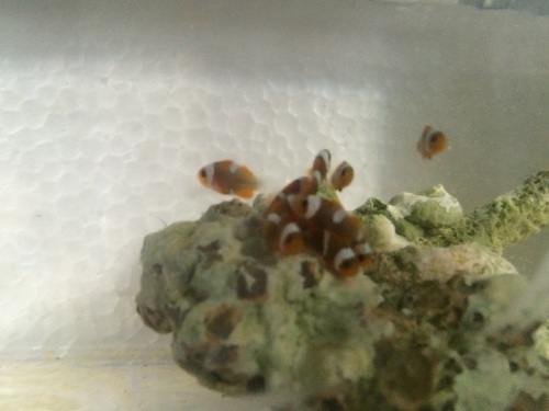 はい。。サンゴ・・・よくわからないですね~。。ウチに1年半以上居るスジチヂミトサカですが、風前の灯になってきました。。。もうたぶん復活はないでしょう。。。逆に最近勢力を伸ばしているのは。。。ハタゴイソギンは巨大化の一途をたどってるんですが。。。2年以上のチガイウミザミが最近調子よくなってきた??感じがします。。一時はもうダメだろうというくらい小さくなってきてしまったんですが、大分戻ったというか・・・以前より大きくなってきてます。。今は枝ライブロックの先端に鎮座してるんで、他に移動も出来なく、ブクブク太るだけなんですが、1個体、どうも近くのライブロックに移動をはじめたっぽいので、こちらがどうなるかですかね。。この1個体・・・自分の重さに耐えられなくて・・・枝ライブロックからぶる下がったら・・・ちょうどライブロックがあったという(笑)更に、カワラフサトサカも2年近くなって倍以上になってきましたし、スタポも調子いいですね~。ウィスカーズは今一?調子がよくわからないサンゴですが。。(笑)そしてチャイロイシに至っては、ハタゴさんの巨大化によって接触が起こって一部がダメージを負ったんですが、何とか戻ってきてますし。。。白化するかな??と思ったけど、特に何もなかったかのようになってます(笑)そんな中でも、スジチヂミだけは衰退していくという。。。う~ん。。わからないですね。。まぁウチの栄養塩たっぷり?の水質はあわなかったんですかね。。。まぁ水質計ってないんで栄養塩が多いのかもわかりませんがでも餌を大量にあげてコケも生えるような水槽ですからね~。栄養塩は多いに違いない(笑)あっ。。写真はまた今度載せます。。さて~カクレの稚魚ですが、1日目の朝に約半分が☆になり、その後もポツポツ数匹単位で☆になっているんですが、なんとか20弱くらいは居る感じですかね??(水槽のプツプツは気泡です。。)初日よりかは成長してるのかな~。。。よくわかりませんが。。。明日くらいからブラインも少し混ぜてあげた方がいいのかなぁ~と。。。こちらも色々と悩みの種ですね。。。というか・・・朝晩の換水が大変です