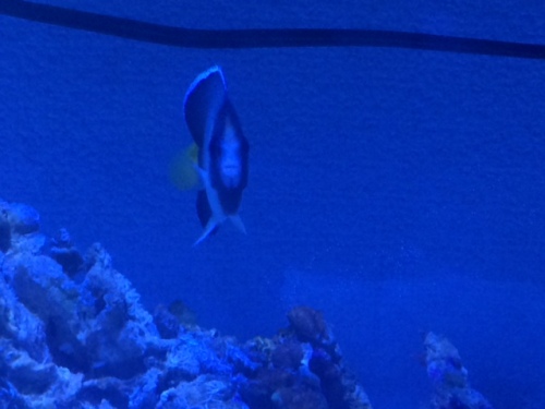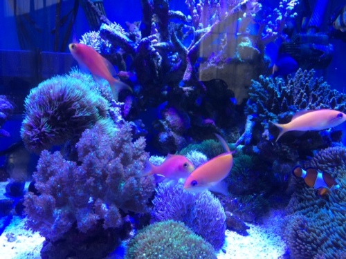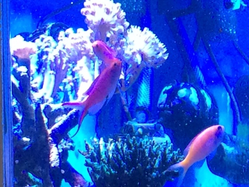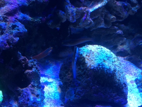 コメントで新魚の正解は出てしまってましたが。。とりあえず、まだ生きてるので先に紹介します。。いつまでいるかわからないし・・・まずは、近所のショップで買った方の魚ですが~。オオテンハナゴイでした!入荷速報に載ってたので、ちょっと見てみるだけ見ようと思っていったら、サイズが大きくて発色が凄く綺麗だった為・・・お持ち帰りしてみました。。写真は、近くで撮ろうと隠れるので、ちょっと離れて撮影してるんで、あまり上手く撮れてません。。スマホっていうのもありますが。。ちなみに、電気がついてる時は特に隠れることもなく、水槽の前に立っても普通に泳いではいます。。アカネにちょっかい掛けられることもなく・・・大きさが同じくらいだから??ただ、やはり大きいからか?餌を食べさせるのがなかなか難しいんですよね~。。ウチは今、メディフィッシュをメインであげてます。あの餌は浮遊する時間が長いから食べてくれるといいなぁ~なんて思いつつ。。。今一な感じ・・・。冷凍コペもぱくついてるのは見ますが、体も大きいし量がそんなに食べられないから微妙なんじゃないかと。。何とか人工餌を食べてくれるようになるといいのですが。。。ちなみに、フチドリハナダイの1匹はやはり姿が見えないんですが、アカネの小さい方はライブロックの隙間で生きているのを確認しました。。ただ、寿命なのか?体色も褪せてきててあまり動けないような状況です。。捕食生物が居たら間違いなく捕まっちゃう感じ。。でもまだ2年ほどなんで寿命じゃないのかもしれませんが。。。そして、ギフトさんから来てた魚は。。。ママさんの鋭い指摘の通り、シマでした大きい方。。小さい方。。。水槽サイズが45キューブになったので、入れられる魚の数もサイズも制限される為、どうしようか非常に迷ってたんですが、シマにすることにしたんです。スミレもいいと思うんですが、スミレは大きくなるのが早いみたいですし。。ちょうどそんなことを思ってたところで、ギフトさんにいくつか入荷があって、5.5cmと4.5cmの2サイズを購入してみました。。まぁ折角なんでペアで入れられたらいいなぁ~くらいなイメージで。。とりあえず、今は別の水槽にそれぞれいれて、隣り合わせてお見合い中?です。餌はどちらも人工餌を食べるので、もう少ししたらデカい方がいる30cmキューブを仕切って、チビを入海させてお見合い。。で、その後合流予定です。。まだまだビビリで、写真は上手く撮れませんが。。。またその内紹介できたらと思います。。。