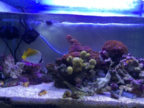 久々の更新となってしまいました。。。ネタがないわけではないんですが、なかなか更新する時間がなくなってしまってます。。というのも、いつもは職場の昼休みに書いたものなんかをUpしてたんですが、今行ってる客先でウィルス騒ぎがあってから、ブログ系は一切開けないようにフィルターがかかってしまい、なかなか更新できなくなってしまったんです。。まぁしょうがないってことで。。^^;皆さんのブログもちょこちょこ確認はしてるんですが、なかなかコメントできずにすみませんです。。。といったところで、最近の状況ですが。。7月の終わりくらいにチャーに行ったときに購入してきたレッドスクーターは何気に生き残ってます。最近は、冷凍ブラなんかを落とすと、たまたま近くにいた場合は食べるようになってるんで、しばらくは大丈夫かなぁ~なんて思ってます。。水槽全体ですが、セブ産のスターポリプが大きくなってきてしまい、勢力拡大によってポワイトのスターポリプを飲み込んでしまい、ホワイトがダメになってしまいました。。スペースもなくなってきてしまったので、セブ産のスタポは某オークションでほしい人に引き取ってもらいました。。ただ、まだ子株があるので、そのうちまた増えるでしょう。。^^;そんなで、少しスペースが空いたんですが、スポットグリーンのスタポも元気になってきて、結構勢力拡大中だったりしてます。^^;他はサンゴも魚も比較的元気で、チガイウミアザミも増えてきましたし、ウィスカーズも株がかなり増えてきました。魚もオオテンが1匹雲隠れしてからは皆元気にやってます。。。ちょっとメタボ気味ですが。。そんな中、ちょっと前にシュリンプでアミエビとコペを購入した際に、ちょうど時期なのか、マメチョウがいっぱい売られてまして・・・ついついワンコインってことで、フウライチョウを購入してしまいました(笑)自分にはうまくチョウは飼えないってことで、チョウは二度と飼育しないと思ってたんですが。。とりあえずチビなので、カクレのチビたちと一緒にサテライトに入ってます。。白点が数日してからついたのですが、オキシを添加して何とか大丈夫?な状態になってます。。エサは・・・ブライン沸かしたのが好きなのと、冷凍ブラも食べてますね~。。人工飼料は食べてるのかわかりませんが。。。^^;それと、こりもせず・・・ギフトでセールになってたブラックスノーオセラリスを買ってしまいました。。。先住のチビと上手くやってくれるかなぁ~と期待しましたが・・・ダメですね(笑)かなりケンカしてますが・・・まぁお互いにボロボロになってないので、様子を見てる状況です。。こう考えると、飛び出したスノーフレークは相性がよかったんでしょうね。。。残念。。さて、こんな感じの水槽状況ですが。。。また更新できる時があったら、更新したいと思います。。。^^;