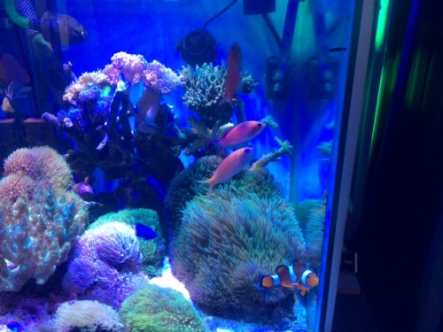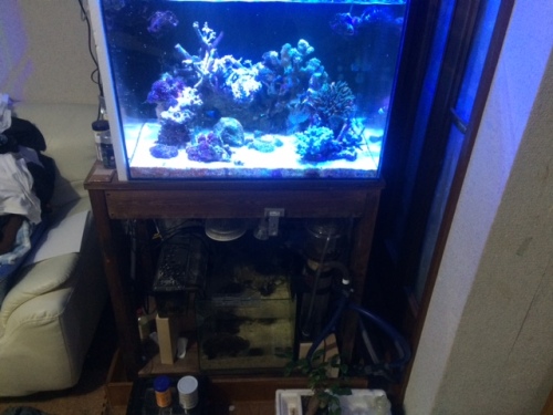 前回の記事で水槽移動の記事を載せましたが、先週の土曜日に無事?に移動しました。。。玄関に移動です。。。奥の小さい水槽は、ミドリフグが居る水槽ですね~。水槽サイズが60×45から60×30にスケールダウン。。。そして高さも5cmほど低くなったので、やっぱりサンゴがキツキツです。。全体的にはこんな感じでキツキツ。。たーー坊さんの家にウミアザミとウィスカーズ、マメスナが旅立ちましたが。。。(ちょっと配送トラブルが・・)それでもかなりキツキツなかんじですね。。やはり奥行きが15cm小さくなるのは大きいですね。。まぁしょうがない・・・。とありあえず、リセットも出来た感じで、サンゴの調子も問題なさそうなんでよしとします。。ちなみに・・・この前の記事の最後に写ってたブッシーの稚魚ですが。。。近所のショップに出荷!?引き取ってもらってきました。。まぁまた第三弾が産まれてるんで・・・その内引き取ってもらわないと。。。