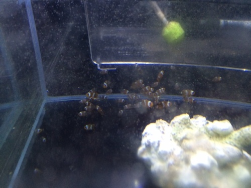 昨日の夜、カクレクマノミの稚魚がハッチしました。。。ほとんど掬ってしまった後なんで、ほとんど写ってないですが、真ん中の白い点の左したに居る小さいのが稚魚です。前回は気が付いてから10日くらいで孵化?した形跡でしたので、予定日を金曜日に予想し、そこから毎晩見てたんですが、ついに昨日稚魚が泳いでるのを発見できました。これで正確な日数が出ましたね。。ウチの水槽の水温(25℃くらい)だと、卵が出現した12日後には孵化するみたいです。写真のようにライトで稚魚を寄せて、ホースで吸い取りました。。全部の回収は無理でしたが、ほぼ掬った感じですかね??全部でパッと数えて50は超えてそうでしたが、朝見ると半分は☆になってました。。。親の栄養状況で生存率と発生率もあげられるみたいですが、なかなか今の現状では難しいですね。。とりあえず、生き残った子供を少しでも成長させてあげられればと思います。。まぁ初めてですし、色々試させてもらいながら、様子を見ていきたいですね~♪ちなみに、ペパーミントシュリンプもまた抱卵してるようで。。。今日明日くらいには、こちらもハッチするかもしれません。。。稚エビを採取してみるかどうか悩みどころです。。^^;