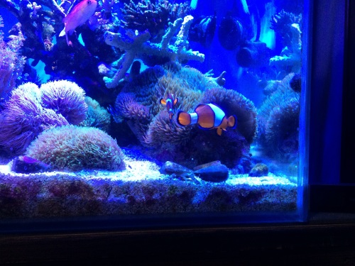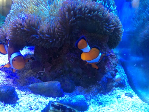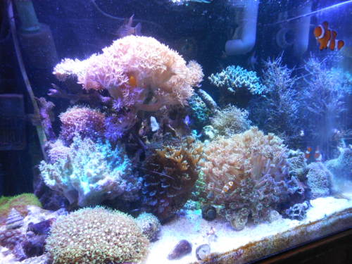 久々の更新です。。^^;2か月以上あいちゃいましたね。。。え~その間にいろいろありまして??(笑)スノーフレークのペアは何故か突然死・・・そしてハタゴは某オークションで引き取ってもらい、水槽は1個減らすことに。。そしてメイン水槽ですが、レッドスクーターにブラインあげる為にちょっと水を汚した為か??なんとシマが白点?か何かにかかってしまい☆に。。PHが上がらない状態が続いたんで、多分リン酸が凄いことになっているんだと思い、水槽リセットすることに。。冬はPHが落ちやすい(ヒーター使うんで・・)ので、眠っていたアクリルの60ワイドを引っ張りだし、少しでも水量を稼ぐことに。。。ただ、リセット後にオオテンが☆に。。。そして、先日追加したアフリカンフレームもショップでは調子よかったのにうちに来て1週間で。。。ダメダメですねもう海水辞めようかとも思いましたが、サンゴは調子いいのも居るので、まぁのんびりやろうかと。。そして少しスペースができたんで、久々に先日ハナガサを入れてしまいました。。^^;どうなることか。。ってことで、水槽の全景です。。チガイウミアザミの勢いがすごいことになってます。。枝ライブロックの先に移してたんで増えるのは抑制できてるんですが、サイズが大きくなってきました。。おかげで下にいるサンゴに光が微妙に届かない。。^^;その後ろにいるウィスカーズも正面からはあまり見えないという。。ちなみにウィスカーズは1年たって、ポリプは6,7倍に増えてますが、伸びてないんでかなり窮屈そうです(笑)そうそう!カクレチビ達ですが、水替え時に飛び出したり、減ったりで現在3匹だけ残ってます。。ちなみに一緒に写ってるのはオスのカクレですね。。メスは水槽内をあっちこっち移動してます。。さてさて、今年もあと明日1日で終わりですね~。。なんか1年があっという間(笑)なかなか更新ができてないですが、来年も気が向いたら!?更新できると思うので、またのぞいてやってください。ではでは、少し早いですが、今年もお世話になりました!来年もよろしくお願いします!よいお年をお迎えください~!(^o^)ノシ