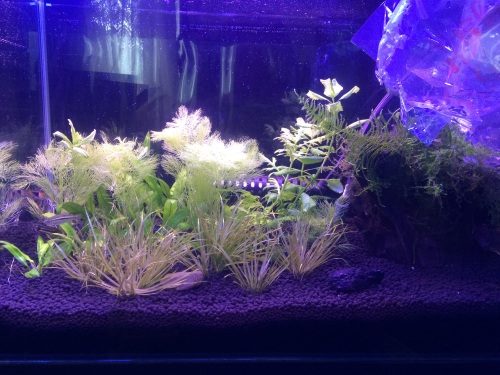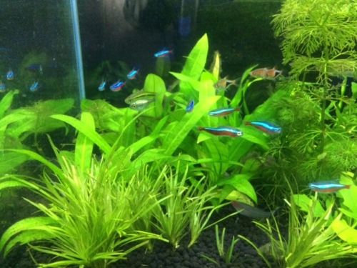 はい。。シマヤッコ大の経過報告になりますが、結論から言うと、昨日帰宅したら☆になってました。。原因は不明です。。。というのも、動きがおかしいのは気になってたんですが(覇気がない感じ)、餌も食べるし、何より体格は以前いたシマと同じようにかなり肉厚な状態でした。。パッと見だけなら、かなり状態が良さそうに見える個体だったんですよね。。トリタンなんで、簡易濾過とはいえ、もう一匹の方が環境としては悪いのに元気なわけで。。これは本当によくわからなかったです。。死骸を見ても寄生虫とかついてなかったですし。。。元々どこか調子が悪かったのか・・・それともウチで悪くなったのか。。。う~ん・・謎。。ペアへの構想は露と消えましたが、チビの方は元気なんで、とりあえず1匹だけ今度メイン水槽に放流してみます。粒餌は爆食なんで、問題ないでしょう・・・たぶん(笑)そして、カクレペアですが、卵は本当に両手で数えられるくらい?まで減ってますが、何とか少しは残ってる状況です。。産卵から1週間経つので、上手くいけば明日か明後日くらいには孵化するかも??こちらもよくわかりませんが(笑)さて、もう一つの題名の淡水水槽ですが、ディスカスの調子が最近悪くなってしまい、小さい水槽でストレスかかってるのかな~と思い、60レギュラーを引っ張り出してきました。。。折角なんで、砂も大磯砂からソイルへ。。。水槽が大きくなってちょっと寂しいので、ライズからカージナル20とラミーノーズ10を購入し、水草も少し足しました。それにしても30匹に送料いれても1700円はありえない(笑)少し賑やかになりました。背骨が曲がってるカージナルが先住で、もう6年目の個体になりますね。チャームから20匹買って、現在残ってるのは4匹。。。ライズからのサイズに比べて、倍以上の大きさがあります。ライズから来たのが、ワイルドなのかブリード物なのかはわかりませんが、また長生きしてくれるといいですね~。。