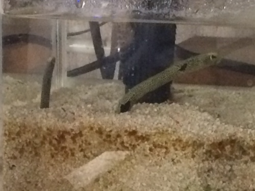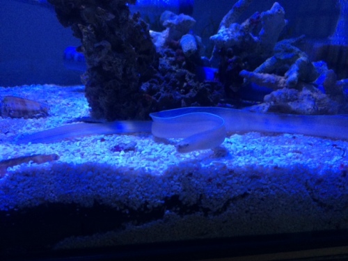 最近の記事はどうも、死んでしまった系の話しか書いてなかったので・・・。たまには違う話も・・・と思ったんですが。。。で~、モスさんがコメントでリフのチンアナゴはどうしました??と言われていたので、久々に載せてみます。。水面までの距離が短くてかわいそうなんですが。。でも水面に浮いた餌も食べられるので、ある意味いいのかも??ちょっと前に、どこから脱走したの!?という感じで、ニシキアナゴが飛び出してしまったんですが、チンはニシキより太い?ので、とりあえず飛び出さずに生きてます。。餌は何でも!?食べるようで・・・メディフィッシュみたいな人工餌も食べますし、コペ、ブライン、ホワイトシュリンプと、流れてくれば!?何でも口にはしますね。それと、大分慣れてきたようで、そこに落ちた餌も、自分の近くなら拾って食べてるみたいです。この水槽は結構な餌を撒くので、そこが汚れてるんじゃないかなぁ~なんて思ったりもしてます。。で、今回のメイン水槽の崩壊トリガーの一つになったのでは??とも。。まぁ憶測ですが(笑)とりあえず、チンアナゴは飛び出しに気を付ければ、慣れれば餌もよく食べますし、病気にもなり難いみたいなので飼いやすい種なのかもしれないですね。まぁ、まだ飼育2カ月くらいなんで何とも言えないかもしれませんが。。。何とか長期飼育出来たらいいなぁ~と思います。