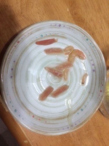 今日は先日来たハナヒゲが餌を食べるまでの模様を書いておこうかと思います。。。が!まず・・・メイン水槽の不調について。。。もう最近こればっか・・・そのメイン水槽ですが、先住シマもやられました・・・オレンジストライプのペアは何とか生きてはいますが・・・そして、叩いても死なないのでは!?と思っていた、ブレニー三銃士の1匹。。。ドットダッシュがダメそうです。。。キイロサンゴハゼも怪しい雰囲気。。。そんな中、アカネハネゴイとシリキ、他2匹のブレニー&マンジュウイシモチは平気な顔をしてますが。。。こんなに一気に来たのは1年以上ぶりなので、呆然となってますが・・・・・まだ落ち着くことはなさそうなので、後日落ち着いたらまた記事にします。。。後どれだけ落ちるか。。。さて~それでは題名の方の話で・・・前回の記事でハナヒゲウツボを紹介しましたが~このハナヒゲ・・・ウツボの中では餌付けが難しい!?種類っていうことになってます。拒食で餌付けないまま餓死する個体もいるとか??ヤッコでいうシマやスミレみたいな感じなんでしょうか?ショップでもやはり餌付けが難しい部類ということは聞いてきました。。実はこのハナヒゲを飼うにあたって色々調べてみると、確かに難しそうなんですよね。。。特に餌。。。始めは生餌がいいらしく、メダカやドロメなんかをあげてる人も居るみたいでした。。中には数日でウチのミドリフグの主食でもあるひかりクレストキャットを食べる個体も居るみたいでしたが(笑)とにかく落ち着ける環境の方がいい事はわかったんで、ウツボしかいない水槽だし、ちょっとチャレンジしてみようかなぁ~と。。。ショップで餌上げを見せてもらいましたが、一緒にいるハタ(笑)が餌を奪って行ってしまい、全く食べられません(笑)しかも、結構長い時間ショップにいるみたいで、痩せが気にはなったんですが、連れてきちゃいました。そしてまずは水合わせ。。。ここでさすがウツボは飛び出しやすいということを経験。。。バケツから体の半分以上を水上に出してバケツを乗り越えようとしてました。。何とか手でブロックして防ぎましたが少し落ち着いたタイミングで、冷凍エビを投入してみると、一瞬咥えましたがすぐに離してしまい、なんか違う感じ。。。ホワイトリボンはあっさりエビを食べてくれたんで楽でしたがじゃぁ~ということで、どうもこのウツボは魚食性が強い気がしたので、スーパーに行ってにらめっこ。。。マグロにしようかカツオにしようか。。。(笑)自分の考えでは、魚食性が強ければ、血の匂いが強い魚の方が、餌付きやすいと思ったんです。。。で、血の匂いならカツオ・・・とも思ったんですが、マグロが安くなっててんで(笑)マグロに決定それを口に入る大きさにカットして。。。こんな感じ。。。これを電気が消えた状態で、鼻先に持っていったら。。。あっさり食べましたということで・・・何も難しいことはしてなかったりします(笑)ホワイトリボンより、かなり食べるんで調子に乗ってあげてしまったのが一昨日。。。昨日は何も食べず。。。ちょっとまずい??とも思いましたが、まぁその辺は様子見ですね。。。それに引き替え・・・ホワイトリボンは毎日マイペースにエビ1匹を食べるだけなんで・・・こっちの方が気が楽は楽ですね何にしても、メインがあんな状態なので・・・ピンセットから餌を取ってくれるウツボに癒されてます