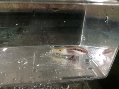 はい。。。2週間ぶり?の更新になってしまいました。。まず題名のやってしまった感ですが。。順調だったチビニモ達。。。全滅しそうです。。。いや・・・たぶんするでしょう。。。結構大きくなってたんですが、何が問題って。。。全く太らないんです!☆になっていく魚のまぁ薄いこと。。。紙か!?っていうくらいなので。。。原因の一つ考えているのは、常に泳いでいるので栄養価の高い餌を食べないと、生きてるだけでエネルギーを消費して太れないのか??と考えています。。養殖ものにありがちな体形の崩れた魚が嫌で、ある程度泳げるようになったら泳がせるのを優先させえてしまったのが一つの原因かもしれません。。そしてもう一つが、人工飼料に餌付けるタイミングをミスったこと。。この大きさなら人工飼料に餌付かせるべきだったんですが、ブラインやるのが楽でそれをメインにしてしまったのも原因かもしれません。。。そして体力の弱ったところに、たぶん病気が入ったんだと思います。。。何回かサテライトにしたりやっぱりブラインが流れるから水槽に戻したりといじりすぎたのも原因ですかね~。。何にしても、非常に稚魚達に申し訳ないことをしてしまいました。。。自分の中では、産まれてから1カ月くらいまでの方が飼育が楽に思えてきてしまいました(笑)ちなみに、第6弾は大分大きくなりました。。。第5弾まで全て生きてたとしても、第6弾の方が多いくらいです。。こちらは今のところ順調ですね・・・ちょっと過密なのが気になりますが。。。こちらも餌の切り替え時期を誤らない様にしないと。。。さて・・・そして、第7弾は産まれました。。どういうわけか奇数の回の時は、全部上手くハッチせず、今回も2日に分かれてて、1日目の個体しか採取できませんでした。。。といっても、30くらいはいますが。。。こちらも安定期に入ってるので、☆になっても一日1匹とかですね。。第8弾はとりあえずまだですが、どうかなぁ~と微妙なお腹の膨らみです。。そろそろ止まってもらわないと・・・淡水クロレラ購入するのにエライお金が掛って参っちゃいます。。クロレラは安いけど・・・送料がね~・・・(>_