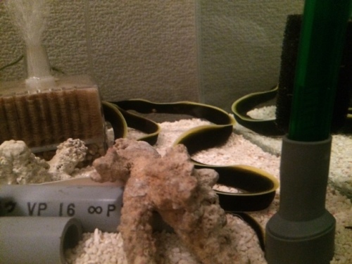 いきなりですが・・・メイン水槽はダメですね。。。先日の記事の後スミレヤッコが亡くなりました。。。その後、どうも魚の様子がおかしかったんです。。。オレンジストライプも前に出てこなくなりましたし、他の魚も隠れ気味に・・・。よくよく観察してみると、どうも先日入海のヒメゴンベが、他の魚にちょっかいを掛けているように見られました。。。いつかの光景を思い出し・・・意を決してゴンベはニモ水槽に移っていただきました。。。それから、魚も前に出てくるようにはなったんですが、それでも微妙な感じ。。。そして、今朝様子を見たら・・・シマの片割れが、非常にフラフラと泳いでる光景を目撃。。。悲しいかな・・・魚の状態はよくわかるようになってしまったんで・・・あの様子では、今日帰宅するまで生きてはいないでしょう。。。ここにきてメイン水槽の不調を、色々と考えてみたんですが、バイオペレットを撤去(フィルターの水漏れ・・)したのが始まりで、シマの片割れが便秘になったことをきっかけに、水槽の掃除!?リセット!?をして、メイン事項だったシマは捕獲⇒淡水浴。。。このリセットで、安定していた細菌や微生物が大量に消失したことで、一気に歪が出てしまったんでしょうね。。。連結している、ニモ水槽の底面フィルターは効いてますが、それだけではダメだったんでしょう。ここで、更に追い打ちを掛けたのが・・・微生物が少なくなったことを気にして、某ショップからアミエビとコペポーダを仕入れたんです。。。しかも、普通は生体だけ捕まえて、その水は捨ててたんですが何を思ったのか!?その水ごと水槽に投入。。。おそらくこれによって、いらない細菌類まで投入してしまった可能性が。。。多少又は安定している水槽なら問題なかったんでしょうけど、リセット直後ですからね。。。水槽におけるインパクトが強烈だったんでしょうね。。。久々に何も考えずにやってしまいましたね。。。そして体力がまだできてなかったスミレに一番初めに症状が出たんでしょう。。。後は・・・ヒメゴンベの存在も、もしかしたらストレスに影響してたのかも。。。メイン水槽はしばらく生体の追加は無理ですね。。。少し安定させてみます・・・まぁヤッコ以外は皆元気になったんですけど・・・。そんな水槽に疲れ気味!?+プライベートで衝撃的な事があり・・・日曜日に生体を増やさないつもりでいたのに、1匹増やしてしまいました。。。まぁストレス発散&現実逃避ですねいつものベッセ○ですが、なんとB級のインドニシキが5980円という・・・非常に魅力的な罠があったんですが、何とか掻い潜り・・・お目当て!?の魚をゲットしました。。。黒いです。。。そう・・・自分の腹のようにクロ・・・はい。。。再度、ニョロニョロです(笑)ホワイトリボンが上手くいったのをいい事に、更に追加してしまいました。。今度のはハナヒゲウツボっていう種類ですね。。このウツボは、クマノミみたいに性転換するみたいで、黒⇒青⇒黄色って色が変化していくようです。。。ブルーリボンになると高いんですけど・・・まぁ黒なんで・・。そこまでではなかったです(笑)相変わらず餌は食べてなさそうな個体でしたが・・・ある方法であっさり食べてくれました。詳しくはまた後日。。。こちらも長生きできるようにさせたいですね~。。