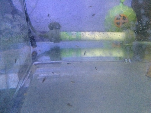 ちょっと久々になってしまいましたが。。特にネタがないんですが・・・。前回の記事の後に第5弾がハッチ予定でしたが、予想通り?というか、第3弾の時と同じ結果になりました。。前日の夜に捕獲した数匹のみで、帰宅するもほとんどがハッチ済み。。。残りも電気消して待ってたんですが、ハッチしないのでそのまま寝てしまい、朝にはもぬけの殻でした。。LoveZ4さんがもういいんじゃない?と言われてましたが、ちょうどいいや~と思いました(笑)ただ第6弾もライブロックについてるので、、まだしばらく格闘は続きそうですちなみに、下の写真は魚が餌を待っている構図なんですが、スマホ向けると若干逃げ腰になるんで、あまり上手く撮れてないんですが、皆この右隅に集まってきます。。ちょうどこの上から餌を投入するので・・・。シマが写ってないですが、シマも皆上を向いて待機するんですよ(笑)(オオテンがめっちゃ上見てますね(笑))で、餌を投入すると我先に食べまくります。。。かなり勢いがいいのでハタゴに接触しないかヒヤヒヤものですが、そこは慣れたもので。。とりあえず魚は皆調子良さそうな感じです。そうそう!ブラインの餌用にマリンクロレラを培養してたんですが、今一増えずに・・・いつの間にか紛れ込んだブラインが成長しています。。右の細長いのがブラインの成長した姿なんですが・・・わかりづらいですよね。。形でいうと、よく田んぼに出るホウネンエビにそっくりですね。。。後は、ドル箱さんが言われてましたがシーモンキーです(笑)これはこのまま飼育してみて・・・稚エビを産むのか観察してみようかなぁ~なんて思ってます。。水替えも餌やりもしなくていいんで、ある意味一番楽ですね。。。