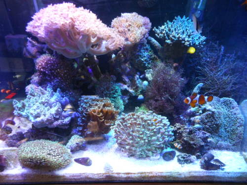 いや~最近は、特に魚もサンゴも追加してないんで、特にネタはないんですが、しいて言えば・・・・・。メイン水槽のサンゴは衰退の一途をたどってますね。。。現在のメイン水槽。。。スジチジミは何とか保ってますが。。。調子のよかったエダアワサンゴが急に調子が悪くなり、欠損が出てきてしまいました。。。まぁハナガサに至っては、全盛期!?は5個体居たのに、今は2個体?・・・いやもうすでに1個体ですね。。でもこの1個体が一番の古株だったりしますが。。。後2カ月で2年かなぁ~。。。子供に誕生日プレゼントで買ってもらったパクパクウミアザミも、もう復活は難しいでしょう。。一時はすさまじい勢いで増えてたんですけどね~。。。ちなみに、これが去年の全景。。。違いすぎる・・・システムとしたらそれほど変わってはいないんですけどね。。。しいて言えば、バイオペレットの中身は変わりましたが。。。前の方がよかったのかな~。。。カワラフサトサカは、ポリプ全開だったり・・・ミドリイシというか、チャイロイシも何故か生き残ってますが。。。このチャイロイシは、もうすぐ1年半になりますね。。。自分の中では・・・パクパクとエダアワサンゴが消滅することになったら・・・メイン水槽も縮小する予定です。まぁ辞めはしないと思いますが(笑)それはそうと、どうもウツボ水槽に最近カーリーが増えてきたんで・・・チェルモンでも入れてみようかなぁ~なんて思ったり思わなかったり(笑)