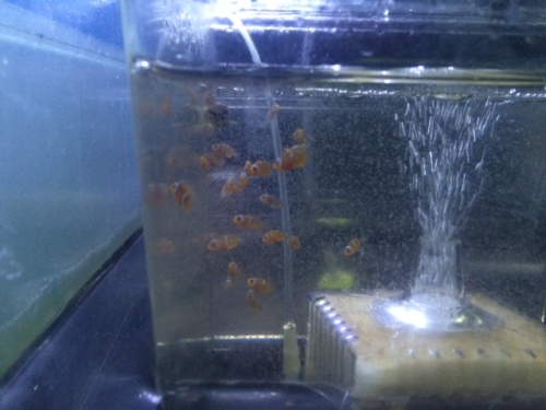 題名の何がやばかったかというと・・・昨日の夜帰宅して第3弾のチビ達の水槽の様子を見ると。。。なんか。。。赤いんですけど・・・そう・・赤いんです。。。何が赤いかというと、水槽の底の一部が真っ赤になってしまってました。。まるで絵具でもこぼしたかのように。。。(焦ってたんで写真はないです。。)さすがに何でだ~!!と思ったんですが、とりあえず冷静になって、まずメイン水槽から水を取って、稚魚達をまず一時的に退避させました。。さすがに皆元気がなく・・・というか、動かない稚魚もチラホラ。。。こりゃぁ~ダメだなぁ・・・と思いましたが、数も少ないんで6匹全てをとりあえず確保してエアレをしておきました。。そして水槽を確認すると、まぁわかりやすく言うと赤潮ですね。。。あの状況と同じ感じになってたんです。。恐らく、何らかの原因でワムシの大量死~赤潮っぽい状況になったのではないかと。。一つ考えられるのは、実はママさんのところにもコメントで書いてたんですが、一昨日の日は気温も低くて、培養水槽からヒーターを出してしまってたので、水温が低くてブラインが一つも孵化しなかったんです。。これには焦って、昨日の朝は一昨日の夜に第4弾が孵化した時用に別容器に取っておいたワムシを投入して出かけたんです。。どうもこれがよくなかった。。ワムシもストック用にエアレはしてたんですが弱ってたようで、大量死~水質悪化になったんだと思います。。昨夜はブライン漬けにしてそのままにし、今朝確認すると何とか皆生きている様子?なんで、とりあえず一安心でした。。。第3弾の稚魚は全滅も一瞬頭をよぎりましたからね。。今日、家に帰って確認してみてどうかだとは思いますが。。。そして第4弾ですが、見事に昨夜ハッチしました。。。この水槽サイズで2個分。。。全部で100は余裕で超えてると思います。。。本当は匹数を厳選したほうがいいらしいのですが(30匹くらい?)、とりあえず掬えるだけ掬ってみました(笑)ちなみに、まだ今朝の段階で20個くらい?は卵が残ってたんで・・・帰った時に残ってれば、こちらも掬いますかね。。何にしても・・・水槽が増えた&最初の頃は稚魚を吸いやすいので・・・朝の水替えが大変です。。