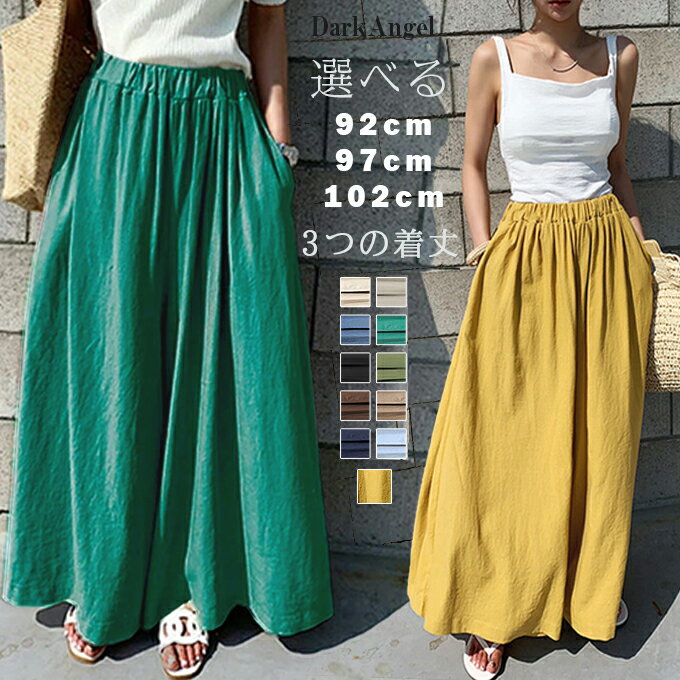 <クーポン利用で1,498円>リネン風 ワイドパンツ レディース 低身長〜高身長 選べる着丈88/92/97/102cm S-XXL 夏 ロング丈 ゆったり ウエストゴム 綿100% ボトムス ブラック 黒 グレージュ 【 丈が選べる リネン風 ワイド パンツ レディース 高発色 グリーン【[】 会場