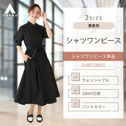 【洋服の青山】《最短当日発送》シャツワンピース 5分袖 レディース 春夏用 ブラック系 黒無地 ウォッシャブル 洗える Aライン バンドカラー 袖カフス カジュアル スタイルアップ効果 かわいい おしゃれ ANCHOR WOMAN