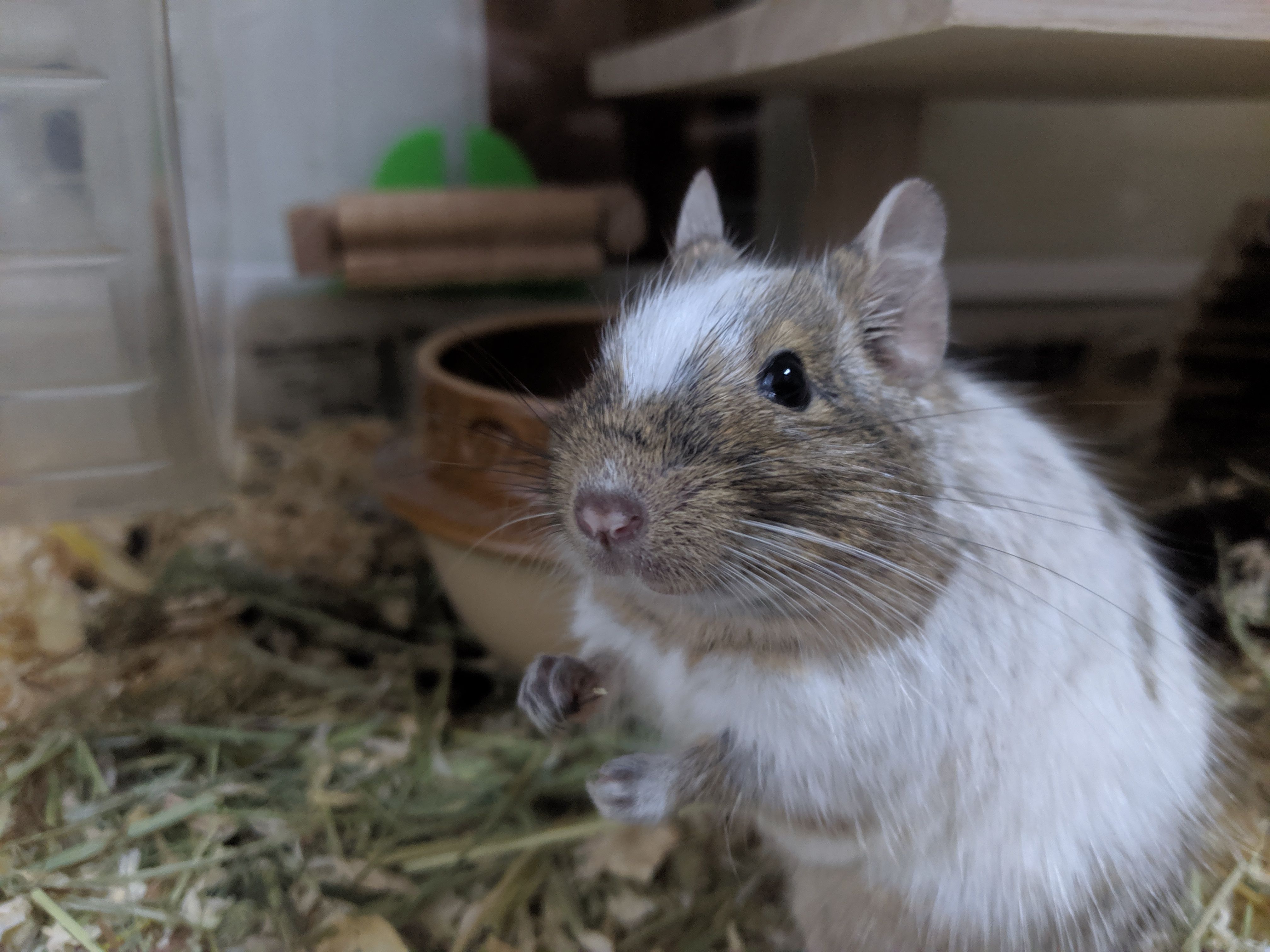 みぞれ模様 ~1日目~2018年11月10日我が家に新しい家族が加わりました。「みぞれ」です。実際に名前が決まったのはみぞれがうちに来た次の日の朝つまり明日です。カインズホーム多摩境店内にあるデグーの聖地ことフィールドガーデン町田さんから電車で片道1時間半二回の乗り継ぎを経て我が家へやってきました。電車内ではお店の人が用意してくれたケース内でチモシーの下に潜って隠れてました。お店の外に出るの多分初めてだから怖かったのかな。家に着いたら、デグー飼育スターターキットを組み立て新居へお引っ越しいつもと違うからか最初は警戒しながら物色していましたが、適応力が強いのかな?すぐに回し車で遊んでいました。デグー飼育歴10年、嫁の部屋着のパーカーに埋もれるみぞれ初日は警戒するからあまりスキンシップとれないはずでは。。嫁の手や腕には乗っかってましたが僕の方には来てくれなかった。。そして名前を決めようと色んな案が出ましたが結局この日は決まらず次の日に持ち越した所で初日が終わりました。明日は名前を決めたり部屋のレイアウトを考えたりと一日中デグー尽くしな日となります。記事を書くのはまた今度。。