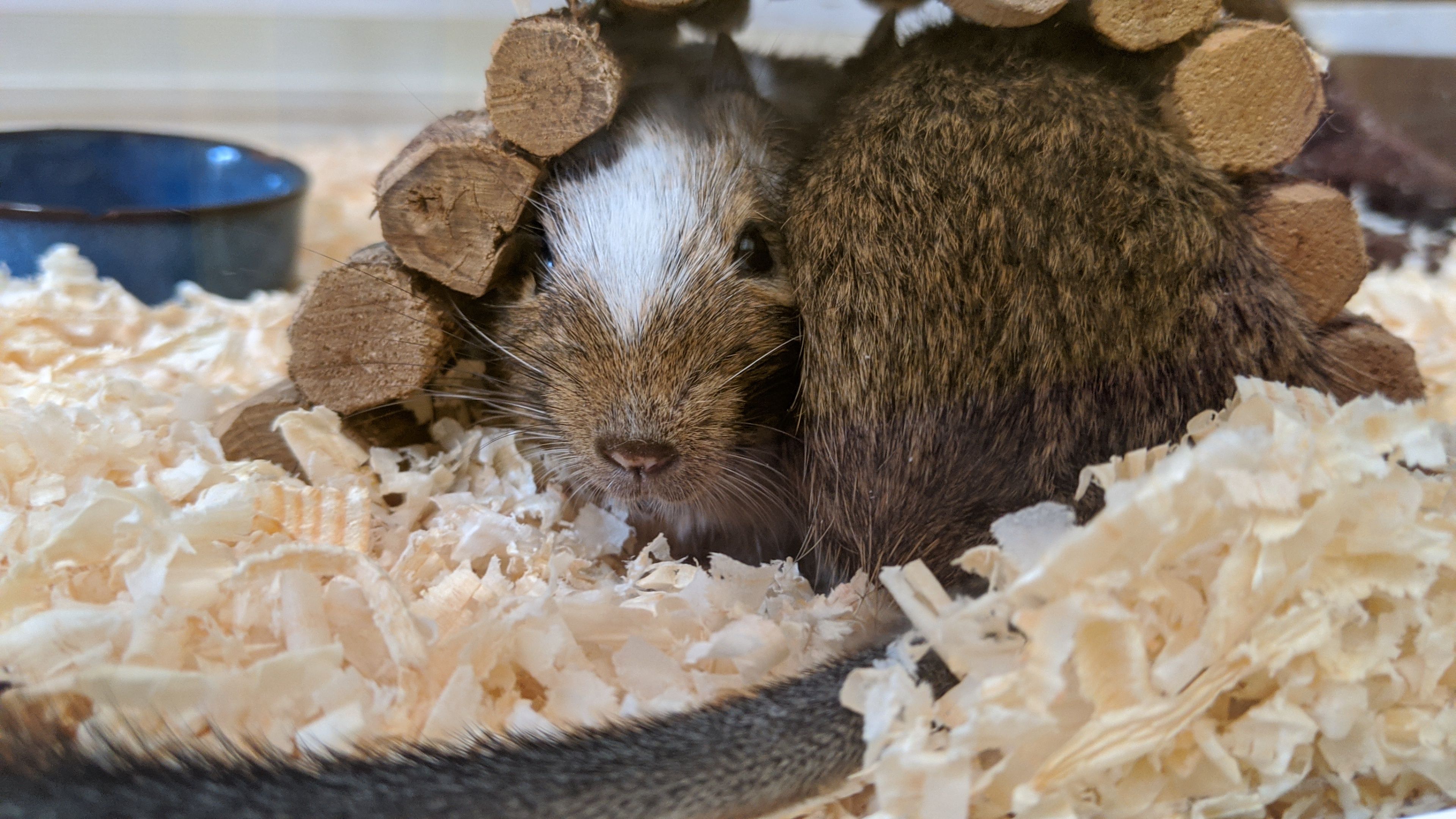 1年ぶりの更新です3日坊主どころか1日坊主でした…。タイトルにありますが飼い主は引っ越しをしました。中古マンションですが以前より広くなりました。快適です。近場での引っ越しだったので、二匹の娘たちは持ち運びできる小さめのケージに入れて自分たちで輸送しました。引っ越して2,3日はかなり警戒してケージの端に隠れたり、木材が連なっててぐにゃぐにゃ動かせる↓に二人して詰まったり、新しい環境に慣れるまで1週間くらいかかったと思います。今はこんな感じ↓妻の作った座布団がお気に入り。大体寝てる。書きたいことは色々あるんですが…とりあえず今日はここまで。気が向いたらちょくちょく更新しようと思います。