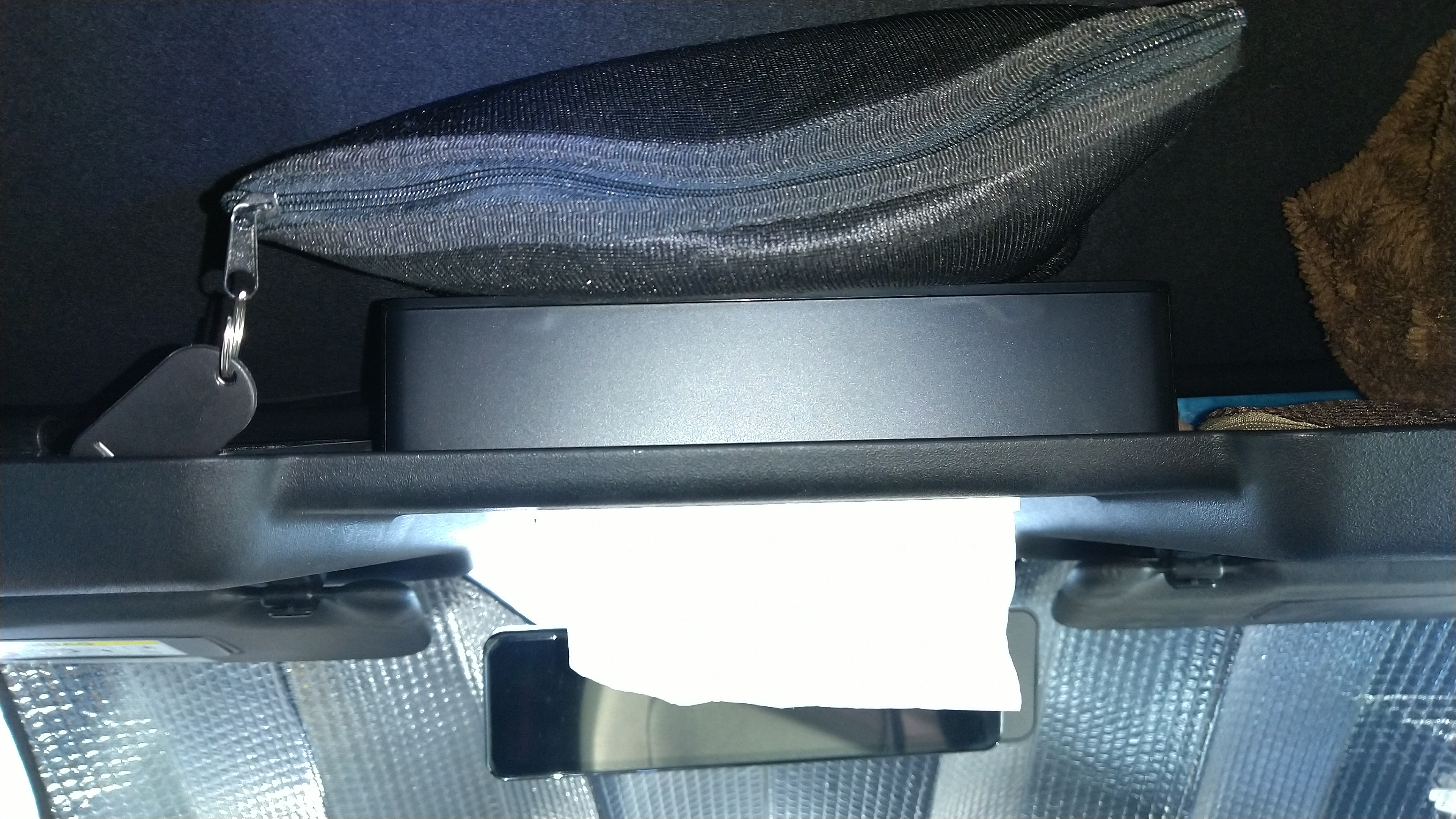 Convenient option parts are attached to this car. I can take a tissue out of the ceiling. However, I took it well and was not able to add me. It was improved.ティッシュ問題ルーフコンソールは運転席の天井に取付けられる棚で、ETCの次に装着率の高いオプションパーツだそうです。少ない収納力が補える上にティッシュが下に取り出せる優れものです。しかし、ピンクやブルーの箱が見えるのが嫌でダイソーの黒い袋に箱無しティッシュを入れていて、かつ、その上に物を乗せていたために、押されて、左右に振りながらも千切れる苛つく状態でした。矢崎産業の黒の「箱無し」用のBOXをAmazonして、逆さにはめ込んだところシンデレラフィットで、見栄えも完璧で、スムースに取り出せて、上にも少し乗せられるようになりました。ブラック内装色にこだわるからこうなるのですが、戯言と笑って頂けれは幸いです。