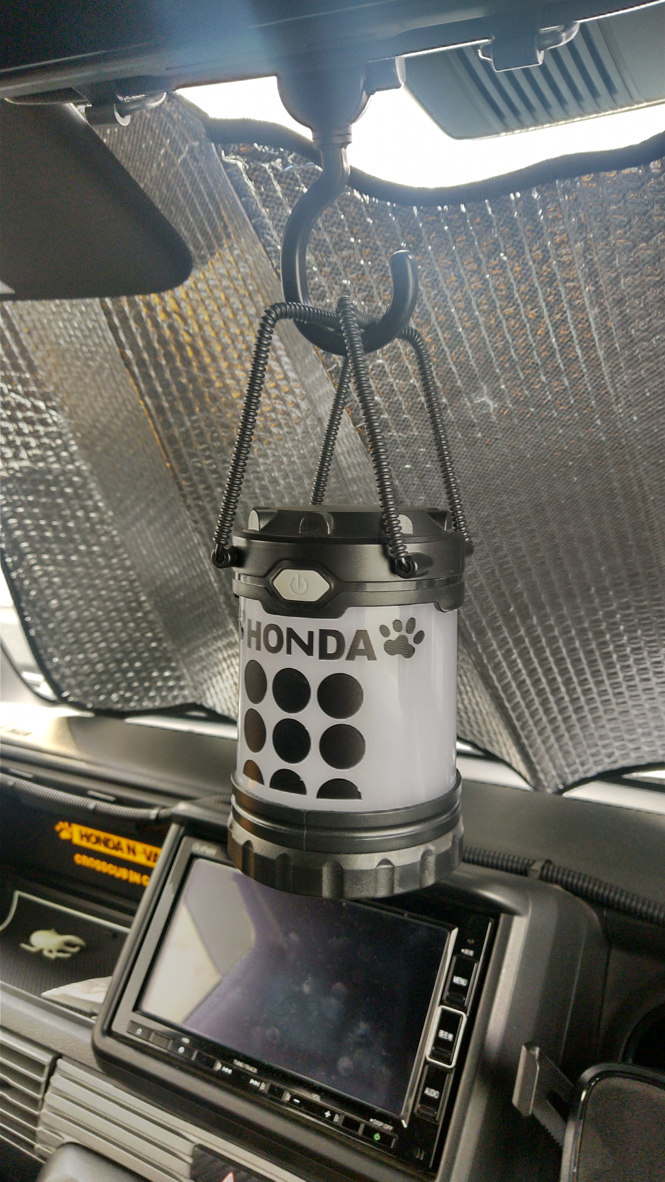 As electric bulb-colored lighting is got in the rear of the cabin, there is no problem. However, it was inconvenient to work as the front was dark. Therefore I gave improvement.前部キャビンの照明後部は電球色のLED照明もあり夜間の作業も問題がありません。一方、運転席と助手席は狭い軽の車内では大事な荷物置き場ですが、意外と暗くて物を探しにくいので何か照明が必要だと感じました。車中泊で要らないもので室内照明を挙げている記事がありましたが、室内灯をつければいいだけなのでその通り。しかしN-VANだけかもしれませんが、時間がたつと室内灯はつかなくなってしまいます。ダイソーで見つけた折りたたみS字フックは、片方が大きくルームミラーのアームにかけやすく、ちょうどよいのが見つかりました。(1泊1改善活動)