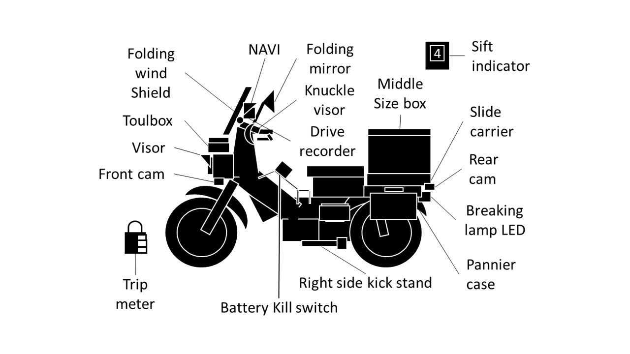 I transferred from the large motorcycle to the small motorcycle to save money. Though it was the motorcycle which was designed to run around lightly in a town, I have got a long-distance race until the equipment to tour. Therefore, I have got up to electricity shortage.★以下カスタムパーツの取付リストと寸評■折り畳みミラー/可倒式風防 #Transporter→小さなN-VANにクロスカブ積載可能です。しかしながら、積み込む際の僅かながらの工夫が必要 です。ここでは折り畳み機構を風防とミラーに施しました。■フロント ツールボックス 前かご部分 #On my little van→ツールボックスはハンドル旋回による風防の干渉を避けるため、ここでも小型のものを装着せ ざるを得なかった。街乗りが多いため施錠できるボックスの装着が必須なためフロントもパニア 部も制約が多かった・・・・(言い訳)■ヘッドライト バイザー #On my little van→いわゆるピヨピヨバイザーを装着し、ヘッドライトをレトロ風にしたかった。好きですこれ。■シフトインジケーター #Siftdoown→初めて乗ったCB400SFにもつけた記憶がありますが、速度メーター内に機械式表示はあるが 半マニュアル車なのでつけた。林道ツーリングではシフトダウンも必要と都心の急坂で練習■トリップメーター #Trip meter→次のJA60モデルより標準装備となる(涙)、ダイヤル式南京錠で代用するカブユーザーの定石。■ナックルガード #Body same color→ガードというより風防、環八で走行中脱落を起こすも何とか回収に成功。見事に再塗装で復活。 ドライブレコーダー・・・・・前有大型車から移植。Youtube見てると幅寄せとか怖いからつけたい■モニター #Navigation sys on cub■フロントカメラ/リアカメラ■NAVI #Navigation sys on cub→前有大型車から移植。高速乗れない分、下道走行が増えて、逆に必要になると判断したが、、、。 ドラレコと併せて小型車には電力消費過大で、バッテリーキルスイッチ装備することに。■バッテリーキルスイッチ #Battery kill switch 1→過大電力消費と走行頻度激減でバッテリ上がり頻発、対策として頑張ってスイッチを自作した。 部品調達から加工、塗装工程、最終仕上げまでの汗と涙の連載シリーズ (No.1-19)■右側サイドスタンド #Right side kick stand→車載時に車内固定に大きな前輪輪留めが、小さいVANにはネックだった。センターではNG、 そこで海外車両用か、右側スタンドを見つけほぼ直立させることに成功。カブには前輪パー キングブレーキが標準装備されているため、これも活用してスペース/重量効率を改善できた。 安全にかかわることですのであくまでも自己責任で創意工夫をしてまいりたいものです。■リアボックス #Transporter■スライドキャリア #slide carrier→発売初期の高価なスライドキャリアをね装備、車載のための全長抑制とタンデム時の展開を 両立。中型ボックスにタンデム用ピニオンシートと半キャップを収めたためボックスは容量 不足になり買い物の時は入らず困った。■サイドラック■パニアケース 初回取付品 #On my little van 2回目取付品 #Slide carrier→パニアケースはツーリングライダーのいつかは、、、の夢。なぜか小型車で初取付した。初回品は スチール製カラー(白)激似の無印良品製だったが、タンデム乗員がガニ股になってしまうのと、 空でも重量感があったため、電設用BOXを流用した小型すぎるイミテーションパニアへ変更。■ブレーキランプ LED化 →ナビ/ドラレコによる過大電力消費の対策で、ライトはすでに標準でLED化されているので、 次に使用頻度が高いブレーキランプをLED化して電力を抑える。店からの提案に応じた。 ウインカーは4つもあるが、はリレー処理が面倒くさそうなので割愛した(恥)
