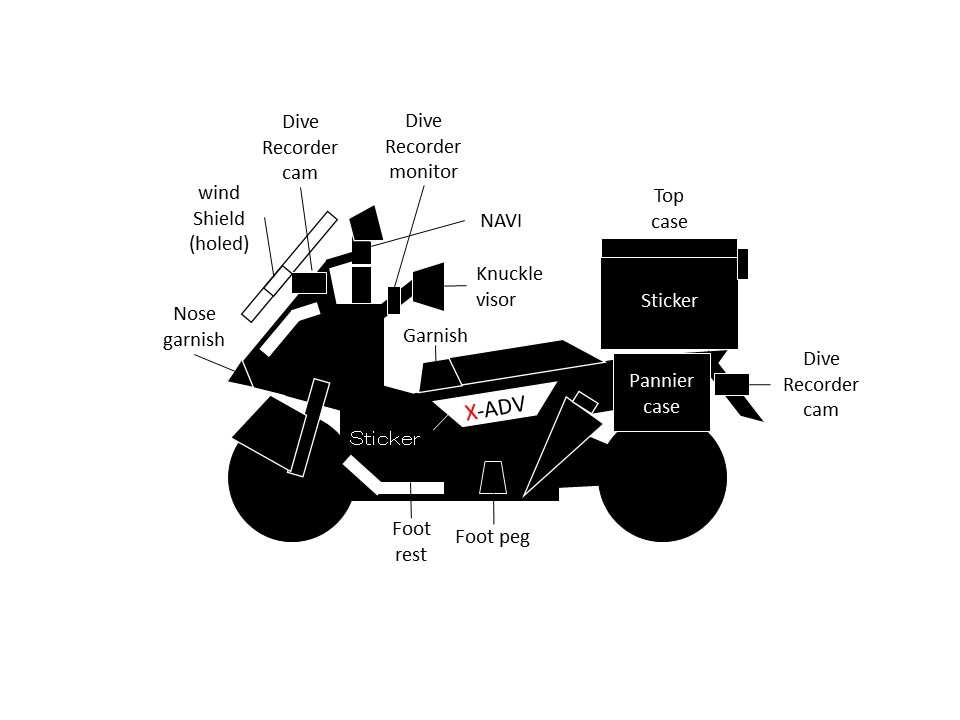 X-ADV is the motorcycle which I liked most. I acquired a license with the license for the large motorcycle to get on this.It is only one style in this motorcycle world. It has a motor scooter-shaped shape, but is large-scale motorcycle for the touring. The person seeing it for the first time is surprised on seeing a huge motor scooter. And the owner has a hard time to explain this motorcycle.■X-ADV カスタム カタログガーニッシュ(ボディ同色塗装/業者依頼) ノーズ #New shield for videocanフューエルリッド #Fuel rid garnishこだわりを持ってカーボン調の素材に業者塗装を施しました。フロントは小さいパーツながら意外とイメージが変わりました。フューエルリッド部は歪みがあり貼りつきが甘く脱落が心配でしたので補修しました。ウインドウシールド(開口部つき) ドイツ製 #New shield for videocanドライブレコーダーフロントカメラ #Mouting pointリアカメラモニター #Drive recorderドラレコのフロントカメラは取付に苦労しました。カウル下部は前輪の可動を妨げ、標準装備のウインドシールドの内側では夜間は特に映り込みが激しく画像は使えません。そこでドイツ製の穴空きのシールドを購入して取付けたところきれいに映し出すことができした。但し欧州部品は納期が1か月以上は必至。NAVI #Night rider #Navigation systemナビを始めとする計器類が夜間きれいなので、当然ながら推奨はされませんが、危険な夜間の高速道路走行が好きでした。標準装備のメーターパネルそして後付けのナビ/ドラレコモニターについては、パリダカ仕様を模して2階建て取付にこだわりました。これは憧れだけでなく、視点の移動が最小限で済むことから安全性の観点から譲らず、先人の方々の取付画像をくまなく調べ、またパーツの買いなおしも重ねてイメージ通りに取付することができました。ナックルガード #knuckl visorこれは標準装備のナックルガードを取り外し業者依頼してボディ同色に仕上げました。しっかりした構造ではあるものの、この大きさと重さでは風切りくらいにしかならないと思いますが真っ黒は味気ないので、費用をかけて業者依頼致しました。トップケース #Top caseパニアケース #Panniier caseパニアケースはツーリング車所有者の夢ではないでしょうか? 20代の時にCB400SFを乗っいるときからいつかはクラウ・・ではなく、「パニアケース」でした。しかしながら、駐車スペースの問題や金額の問題から、取り外しが容易な半ソフトボックスを購入しましたが、車両代替えの憂き目をみることとなり、取付けることなく、夢は小型バイクでの実現を待つことになりました。ステッカーボディ/車名 #Logo stickerトップケース部 #Top caseトップケースは実用箱であるとともに最大面積を持つアートフィールトでもあるため、気味してステッカーを選びました。ヨーロピアンがテーマでもあるため、バンクシーのステッカーを数枚利用しました。とてもオシャレに仕上がりました。フットペグ #Foot pegフットレスト #Foot restフットペグはアイディア商品でスクーター型でニーグリップができないという弱点を補うものでした。果てしなく延々と直進して走りたいタイプなのであまり使う機会はありませんでした。フットレストはスクーターの定番ですが、アルミ板を組み込んだ高級感があるタイプです。カスタム終了/ツーリング開始 #missile #Last run of X-ADV車両代替え・・・・そして、6輪生活へ #Trasporter