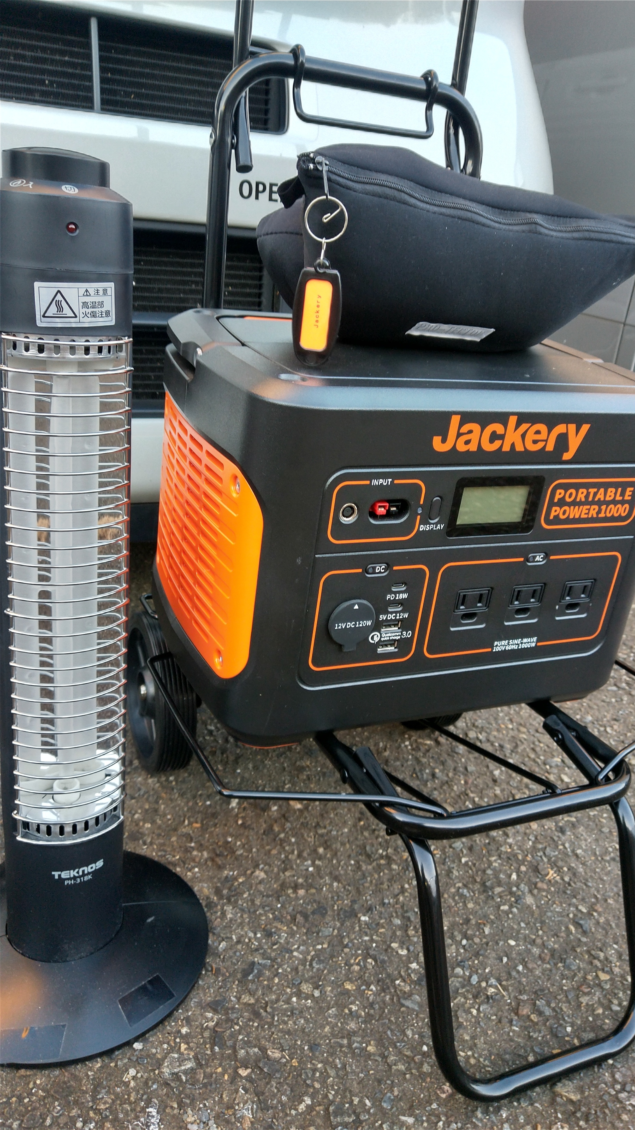 寒中車中泊の可能性を探るため実験泊をしてみました。都内の午後9時、外気温は5℃、車内は6℃でした。前述の300Wの電気ヒーターを連続使用、2時間半でジャクリ1000の電力をすべて喪失しました。