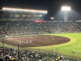 暑い中、甲子園へ行ってきました久しぶりの甲子園以前は春の大会で・・・・今回はナイターの試合でした一塁 アルプススタンドからの応援です!一塁側 アルプススタンドの席下から 26段までは高校の関係者 応援席のような感じです1~15 段 ポール際から 1番です16~26 段 この辺りに高校の関係者、ブラバン 応援のチアガールなどが占めています 多分、同級生もこの中に居たはずです一般の応援席28段~42段43段~63段 自分らの指席は 53段 115番 116番夜だからあまり暑さは感じられませんでした風がライト方向からレフトへ相手は天理高校立ち上がりはいろんミスで点をとられあのまま行ったら、どうなっていたや?点を取られても、あのピッチャーなら打ち砕けるとと思っていましたピッチャーの橋本君のツーランホームランで同点となりましたこれは思っていたとおりです前の男性二人がこちら振り向きハイタッチ!徳島の予選でも誰かがホームランで逆転勝ちでしたから・・・前の若い男性二人とは点が居るたびにハイタッチ(笑それから、隣の女性も加わってねぇ隣の女性と前の二人 4人で 点が居るたびハイタッチ!そのうち4人で応援に熱が入りましたねぇ応援をしていて隣の女性は徳島から車できたとか隣の女性は娘さんがチアガールだそうですなんか久しぶりに阿波弁を聴いた(笑なんか後ろの若い男性達は天理の応援みたいで、隣に男性が来てくれて良かったと!後は まぁ、4人で騒いで応援ですね(笑途中でビールを買って応援です(笑隣の女性は飲みたいけど車なのでって・・・・もうその頃には前の若い男性二人と隣の女性と自分で4人で応援に熱がいりましたねぇ前の男性達はわざわざ後ろを振り向いて4人でハイタッチ!点が入るたびに うぉと叫び、拍手もあり、拳をあげ応援(笑5対4で勝利です!勝利の瞬間、また、四人で笑顔のハイタッチ!てんで知らぬ同士がねぇ、これが面白いです最後は応援の皆が立ち上がって拍手!拍手ですいやぁ、応援にも熱があがり、ナイターで楽しめました!そんなに暑くも無かったしねぇ良かった、良かった!スポーツバーとかで、お酒飲みながら、サッカー応援の気持ちもわかりますねぇ