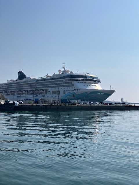 いやぁ、この暑さはいつまで続くのでしょ?たまりませんなぁあんまり日照りが続くと、また、ダムの水がと騒ぎ出すぞ!石手ダム 90.7%玉川ダム 64.7%早明浦ダム 72.6%香川県 ため池数 12,269松山市 ため池数 699 さて、なんか、近所を日傘をさした外国の方が何人か散歩してました?はぁ、なんでははーんと、ひょっとしてまた港にって・・・・・車で見に行くと、やっぱりねぇこの船、以前もきていたよねノルウェージャン・スピリットこちちらがこんなに暑いとは思っても無かっただろうな暑いので、どうせ、夕方に出向だろうと出直し!18時 出航 次は大分へ今年 この船 3回目なのでは?なーんか、今年あと一回くるみたいです今度来るときは日傘は要りませんよ!見送るだけ(笑夕日に向かって出航やなぁおまけあの外港の北側になります海上保安庁の巡視船 いよ がいます全長 70mぐらいかな放水銃かぁ?機関砲?
