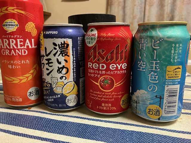 今日は夕方、少しだけ雨が・・・・・なーんか、雷が鳴っているようなと?まぁ、恵みの雨、いや、ほんの少しだけ雨が(笑雨雲は違う場所を通過したみたいです!暑いので、スーパーでこんなもの買いました中には定番のビアもどきもありますちと、変わった名前があれば試しにと・・・・いつもは一番左のを飲んでいます!だって、安いから(笑基本的にはそればかりですたまに、その隣のサワーも(笑ただ、ボウリングで良いスコア、例えば、200アップがでたり、アベが540以上なら、本物のビアを買います!自分へのご褒美ってことでねで、今回は何、レッドアイ?ビー玉色の青い空だってつい、つい名前にひかれて買うことがある(笑レッドはなるほど、トマトかぁ?どんな味なのでしょうねぇトマト味の・・・・・・青い空ねぇ、なーんかネーミングが気になる!よく見たら、金麦とか書いてありましたなるほど、麦が強いのねと・・・・あのアサヒのやつねぇこちらの、西条ってところにそのビアの工場があります以前、そこの工場で、ビアを飲んだことがあるそりゃ、めちゃ美味しかったですわ(笑どうしても雰囲気に負ける!北海道の江差だったかな?ニッカのウィスキー工場で、出来たてのを飲んだ時こりゃ、美味いって(笑夏はネェ、やはり、冷酒が美味いのですが・・・・・飲み過ぎて頭のヒューズが飛ぶので抑えています美味い、美味いと気が付けば、居酒屋の前の駐車場で眠っていたということがありました友人がよく、車にはねられなかったなぁって!今は自宅で大人しく飲んでますので、その心配はない(笑酔って、YouTube見ながら、眠ってることが多いのです!今度、冷酒を買って、飲んでみようかなぁ(笑