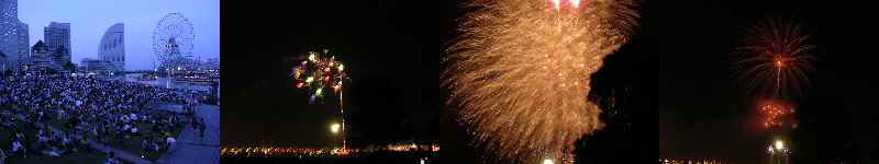 日本丸周辺にも人・人・人 以下花火花火花火・・・こちらも花火花火花火・・・さらに花火花火花火・・・加えて花火花火花火・・・ 去年は3回も行った花火大会だが今年は何だかんだ忙しくしているうちに、あっという間に神奈川新聞花火大会を残すだけとなってしまった。そこで同僚のUが音頭をとって、大々的に楽しもうということになった。当日休みの同僚U・Yその他何人かで横浜港臨港パークという花火見物の中心会場に10:00から場所取りを敢行した。まぁ場所取りと言っても、イベントというと借り出される私のブルーシートを敷いてさっさと場所を確保して伊勢佐木町のカレーミュジアムに繰り出したそうだ。 仕事を休めなかった我々は、早々に切り上げて会場に向かった。私は一度自宅にネイキッドを置きに行き、地下鉄で桜木町に向かい、そこから徒歩で臨港パークに向かった。横浜の二大花火大会だけあって、すさまじい人出。途中早くも臨港パークは入場制限となっていて、お巡りさんに止められたが、「友人が場所取りをしていてそこで19時に待ち合わせしています」と言ったらあっさり通してくれた。 何とか臨港パークの中心にある売店近くに陣取った皆に会うことができた。暗くなる少し前で簡単に見つかって良かった。 早速、焼きそばやおにぎり、焼き鳥を頬張り、ビールも飲んで腹ごしらえ、19:15頃だったろうか、3発ほどの花火でオープン。今回は携帯に加え例のNIKONのCP3100でのシーンモードの”打ち上げ花火”での撮影に挑戦!結局両方撮るのは無理で、私は携帯に専念し、デジカメは同僚Yにお任せ。しかしなんだか今年は今一調子が出ず、あんまり良いのが取れなかった。同僚Yはせっせと撮ってくれて何と88枚も撮ってくれた。おかげで選ぶのが大変・・。 結局今回は職場の人間もうちの課だけでなくあっちこっちから参加してくれ、同僚Uの遊び仲間も加え、19人の大所帯でやんやの花火大会でした。20:20頃最後の花火が終わり、あっさり幕。人でごった返す中、横浜駅まで歩き自宅に辿り着いたのは22:00ちょい前でした・・お疲れ様。