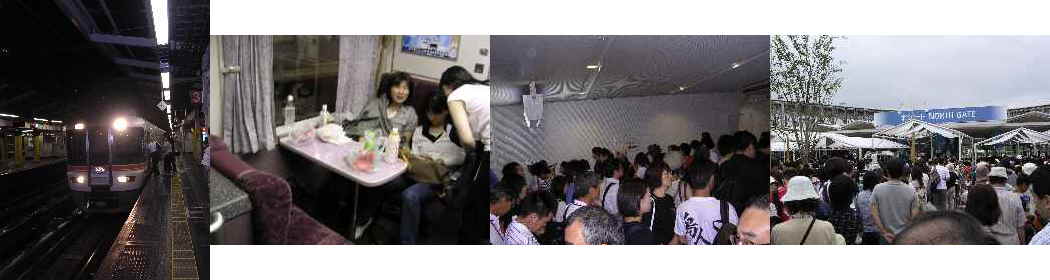 さて何時の間にやら当日08月30日です。仕事から帰りドタバタと準備しているとあっと言う間に23:00です。23:05自宅発、23:17の地下鉄で横浜駅に向かいました。 今回は前にも書きましたが、0泊3日?の往復夜行の強行スケジュールです。この無謀な旅に賛同して参加したのは同僚UとY、それとおなじみのUの友人のNです。夜行「ながら」、写真撮って駆け込み乗車 4人がけのボックス席、リクライニングしない! 藤ヶ丘リニモ乗り換え、ホームもぎゅうぎゅう 北ゲート前、人人人・・ 23:38横浜駅着、待ち合わせは中央南改札に23:45。やはり一発でたどり着けずにどこかの改札で聞いていたら、迷子の同僚Yが来た。聞いた通りに行って、やっとUとNと合流。コンビニでお買い物(お菓子&もしもの朝食代わり?)し、ホームへ。 しばらく待っていて、話に夢中になっていたら気がつくと夜行「ながら」が止まっていて、あわてて乗り込む。乗車券は青春キップとかやらで私には気恥ずかしいものだが、年齢に関係なく使えるそうです(指定券500円+乗車券2645円、本来5枚綴りだそうだが、Nが金券ショップで4枚バラで購入してきてくれました)。指定席なのでゆっくり着席…ボックス席でまとまっていたのは良いが、何とシートがリクライニングしない!他のシートは新幹線並くらいはリクライニングするのに・・おまけに喫煙席しか取れなかったのだが、となりのおじさんがプカプカ・・(まぁなかなか取れない「ながら」を取ってもらった同僚Kには感謝!)。 一通り話に花が咲き、遅まきながら当日のパビリオン攻略作戦会議も行い(迷ったが北ゲートから入り、3人が日立に並び、1人が東芝館に並ぶというもので無謀?)…終わったら03:30過ぎ、あわてて寝に入りましたが、もはや細切れにうつらうつら…。結局トータル2時間ちょっと寝たのだろうか?明日はしんどくなりそう。 06:09名古屋着、少し遅れている、地下鉄東山線へ向かう。ユリカ1000円を買い、ぎりぎり列車に乗り込む(帰りにキップを買う列に並ぶのを避けるため、リニモ共通の物を買うのがポイント)。リニモに乗り変える藤が丘駅まで14駅もある。06:44藤が丘着、リニモに走るが長蛇の列…あぜん。過去1回目は閑散としていて、2回目はちょっと列が出来、今回はホームにさえ入れないとは!3本目の列車でやっとホームへ、07:15万博会場駅着、そこからまた走るが、駅から出ると人の波。 やっぱりすごい!10000人以上はいる(元々サイトで06:00には10000人は並んでいるとは聞いていたが・・ちょっと信じられなかったのだが・・1回目は07:00ちょっと前で15番手?位、2回目も西ゲートだったが07:00ちょっと前で2番手だったのだが・・)。08:00ゲート前に移動、同僚Uはトイレに途中行ったが並んで大変だったようでかなり時間がかかっていた。この時点で予想されていたとはいえ、パビリオン攻略作戦はほぼ絶望的なものとなった・・。ここまで往路編です。