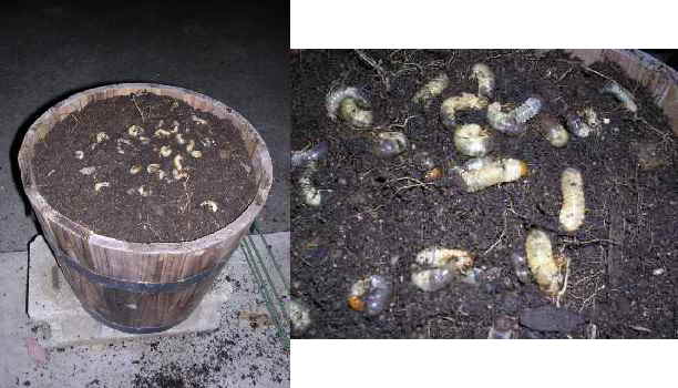 今日は午前中仕事が入ったのですが昼からお休みで、カミさんが花を買いに行きたいというので、近くの「ワールドフラワー」(このあたりでは有名な超安売りのお花のスーパー)に行ってきました。昼食後不覚にも昼寝してしまい、お店に行ったのは16:00近く・・すでに売れ筋は売れてしまったのか、あまり良さそうな花がありません(まぁ季節柄元々あまりないのかもしれませんが・・)。 結局買ったのは、グランベリー4鉢・ベゴニア4鉢でした。その後OKストアーなどに寄って帰ったの時はすでに真っ暗。早速カミさんは、大活躍だったナス(さすがにもう終わりです)の木の樽型の鉢にベゴニアを移植しようとしていたようです。木の樽型鉢 一杯います寒いのかどんどん潜っていきます 私は2Fでネットチェックなどをしていたのですが、カミさんが嬉しそうな顔で「ねぇねぇ・・ちょっと来てみて!」と呼びに来ました。 早速行って見ると、ナスを引っこ抜いて土をかき混ぜていたら、たぶんカブトムシの幼虫だと思うのですが、続々出てきていました。もちろん季節ではないので、今年の夏にカブトムシが飛んで来て卵を産み付け孵化した幼虫です。 カミさんは「腐葉土に卵がはいっていたのかなぁ・・」と言っていましたが、ナスの樽2鉢のうち片方だけに発生して、もう一つには幼虫が居ませんので、たぶん飛んできて生んだのが正解だと思います。 結局31匹の幼虫が居て、適当な入れ物もないので樽型の鉢の1個は幼虫用に供出される運命となりました。その後他の終わった鉢にベゴニアを植えるために掘り返したらまた少しづつ幼虫が出てきたようです。さてがんばって越冬して来年まですくすく育ってくれるのでしょうか?鉢が小さいので春先に前の畑に戻した方が良いかもしれませんね。