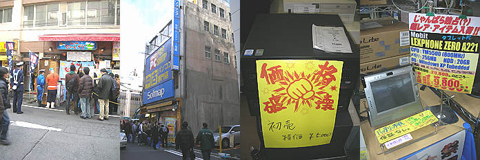 1.じゃんがらラーメンも例外なく取り締まられていました・・。おかげで露天系が無い・・。(じゃんがらラーメン)2.再開発でこの連休で閉店のザコン裏ソフ・・これでこの一角の全てが消え、ザコンとともに大きなビルが建つんでしょうねぇ・・。(ソフ)3.IBMのThinkCentre CeleD2.66GHz/512MB/80GB/CDD/キーボード&マウス&ACケーブルで5000円・・安いなぁ・・(エレパ)4.タブレットPC Mobit LEXPHONE ZERO A221 TM5500(800MHz)256MBmem/20GBhdd/WinXP バッテリー不良で9800円・・(中央通り沿いじゃんぱら) 1.IBMのG40/G41のAC 1980円・・(PCNET)2.旭山動物園のグッズが秋葉原で売られていた・・!(ジャングル)3.見かけたデカBOX・・テールランプ類が後ろに延長されています・・なるほど!(オットー近く)