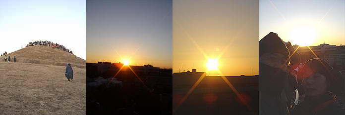 新年明けましておめでとうございます。 いよいよ2009年が明けました。旧年中は大変お世話になりました。本年も宜しくお願いします。朝から初日の出拝んできました・・。 1.今年は3年?ぶりに近くの川和富士に初日の出を見に・・既に頂上は満杯です・・2.2009年初日の出・・3.澄み渡った空にしっかり出てきました・・眩しい・・4.初日の出をバックに二人で記念撮影(シャイ?なのでとりあえずブログ用はわざと逆光です・・) 1.西には富士山が綺麗に見えました(手前の山脈は丹沢山系、その奥に雪を頂いた富士・・)2.川和富士の頂上には360度の眺望が記されたプレートがあります3.お飾りの付いたネイキッド4.お飾りの付いたToday 1.お飾り付きのキャノピー・・新しい家族です2.お正月飾りの玄関3.階段の正月のお花4.おせち・・お屠蘇で乾杯~ しばらくのんびりした後、地元の氏神様へ初詣。 1.行くのが午後になってしまい・・あぁ~長蛇の列・・2.後、もう一歩です・・。3.氏神様・・ちょうちん4.横に御神輿が置いてあり、担ぎ手を募集していました ついでお墓参りにまた白山へ・・。途中秋葉原を行き帰り通過したものの・・ここはじっと我慢で・・カミさんの実家へ新年ご挨拶。一日よく動きました・・明日から早くも仕事です。