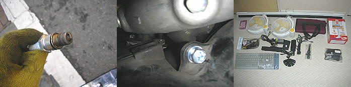 う~ん余計な事をしてしまった・・?ジャイロXはその後も幾つかの訳あり・・を抱えながらも快調に動いていました。話は逸れますが、訳ありは・・1.パーキングブレーキ部のフタを外していれば、パーキングロックは引っかからないので・・そのまま。何時までもこれで良いとは思えないが・・?2.右カーブで傾け方が強いと・・バラバラと言う・・気を遣う・・。3.昔ヒットしたことがあるのか、右に寄れていく・・。まぁこれは体を合わせていくことで・・。4.後輪も何だかちょっとうねってる感じ・・。これも体を合わせていく・・? まぁこれまた訳ありで・・公道を走らないので・・OKということで・・。 さて話を戻しまして、先日夕方よせばよいのに、プラグの焼け具合見てみようかなぁ・・と思い立ち・・しばらく走った後、プラグを抜いて見ました・・まぁ焼け具合は大体良いのかなぁ・・と思いました。 それじゃぁ・・キャブの調整はしなくて良いかぁ・・うちのキャノピーみたいに泥沼になってもまずいからなぁ・・と考え、プラグを戻しました。・・それがなかなかプラグが入りません・・元々少し入りが悪くてすっと入ったためしが無いので、またかぁ・・と思いながら、何度もトライ・・暗くて寒くて・・なかなか入らずちょっとイラっと・・。今から考えるとバカですねぇ・・途中まで入ったところで何を思ったかプラグレンチで強引に締め付けてしまいました・・。 一抹の不安を覚えながら・・エンジン始動を試みます・・セルは勢いよく回りますが全然かかる気配はありません・・トホホ。こうして最も基本的な事を忘れたツケは大きいことに・・。プラグを外してみると・・端子が押されたのか隙間が・・無い!ひぇ~、斜めに入ってピストンヘッドで押された・・?考えれば考えるほど・・バカですねぇ・・ひとまず考えてもしょうが無いのででその日は終了・・。 それからず~と重~い気持ちを引きずって・・やっと今日再度みてみました・・。プラグはダメなので新しいのを買い、付けてみました・・て当然ですが、入りません。覚悟を決めてエンジンヘッドを開けてみました・・以下は写真で・・。 1.プラグの焼け具合は良いようです(写真では白っぽく見えますが・・)・・とこの時は良し良し・・とルンルン・・2.さて強引に押し込んだプラグを改めてよく見ると・・接点の隙間が無い・・3.ヘッドのプラグの入る所のネジ山を見ると・・おぉ~見事に削れてます・・1/3位まで削れています・・。4.心配されたピストンヘッドは無傷でした・・まぁよく考えればヘッドを傷つける・・ったら相当押し込むことになるわけで・・。 1.タップでネジ山を切るか・・と同僚に頼んでみました(彼がタップを持っているのは知っていたが・・結構雑?なので・心配はしたのですが・・)。結局戻ってきたときは、「合うのが無くて太めのでやってみたけど・・ダメだなぁ・・」との言葉と共に・・ネジ山が1/2ほど潰れていました・・。もうこうなったら仕方無いので、プラグレンチに新しいプラグを付けて裏を見ながら慎重にかつ強引に埋め込んでみました。もうこれ以上はエンジンに付けないと回せない・・とこまで回しました。角度的には、合っているはず・・の図です。2.内側から見た図です・・なかなか見る機会はないですよねぇ・・。3.拡大してよく見ると・・まだちょっとねじり込みがたりないですかねぇ・・付属のガスケットリング?が充分つぶれていません。4.とりあえずプラグ付きヘッドを付けて準備完了・・ドキドキしながらセルを回します・・ブロー・・とエンジンかかりました。ふぅ~良かった・・、ちょっと安定しない感じだったので、エンジンマウントのスタッドボルト?をもう少し締め付け・・ついでにプラグもほんのちょっと締めました。気のせいか安定・・。 いや~良かったです・・その後ジャイロXは快調に走ってます・・二度と気楽にプラグの焼け具合を見ることはできませんが・・(焼け具合を見る時やプラグ交換する時はエンジンヘッドを外さないとならないというとんでもないXの誕生です)。 ということで初歩的ミスをするとどんなにエライことになるかということで教訓として残しておきます・・恥ずかしい・・ですねぇ。