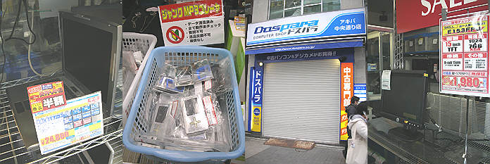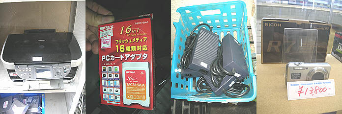 1.CANONのMP800・・家で使っているのと同じ・・\5000とは・・(インバース)2.16in1のPCMCIAメモリーアダプター・・これ良さそう・・帰りに買おうと思っていて買い忘れ・・ \880(オットー7)3.SX260等のACアダプター \3000・・少し値下げ・・(ソフ2号店)4.RICHOのR7が\13800・・安くなったものです・・(PCボンバー) 1.R-ISM・・新しいお店。オットーのネットワーク館跡で、中古PCショップ。元オットーの店員さんがいた・・(R-ISM)2.DellのD用AC・・しかも4.62?Aのもの・・\2980(R-ISM)3.またまた出ていました・・PC2700/172PIN/512MB/MICRODIMM・・ \4480(イオシス)4.ザコン裏のソフもついに閉店・・。様変わりですねぇ・・(ザコン裏ソフ) 1.DellのD用ACなど用のミッキーの平らなACが\100は安い・・(OAステーション)2.少々難あり・・だがMITSUBISHIの15インチ液晶が\2980ですよ~(おらおら)3.帰宅時のプラグの焼け具合・・。良い感じなんですが・・