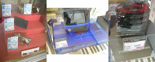 秋葉原他での巡回150606買い物中に気になったものです・・1.「コンパクトカメラ・1万円以下」コーナーができていました・・最安は、CANONのIXY DIGITAL 600・・710万画素/画素欠け/BT消耗・・ですが・・税込み1980円・・(じゃんぱら1F)2.Nintendo3DS、CTR-S-BBAA・・3Dモード解除不可らしいですが・・SD以外全揃い?・・保証無しで税込み7800円・・(じゃんぱらBF)3.N/Bのウェブカメラ、TransFormers USB・・箱・本体・マニュアルのみですが・・税込み600円・・面白い形をしていますが・・?(じゃんぱらBF)1.ONKYOの液晶一体型PC、E713ABC301・・Corei3 3.06GHz/2GBMEM/500GBHDD/DVD-Sマルチ/フルHD対応23インチ/OS無し/側面キズ多し・画面上部枠にキズ・スピーカーに汚れ・・税抜き19800円・・良いですねぇ・・(U-SHOP2F)2.ワイヤレスLED6パックセット、S-0044・・税込み4980円・・面白そうですが・・お高い・・(格安ゲット)3.東京オリンピック2016招致バージョンのハローキティストラップ・・税込み300円、2個だと500円だそうです・・(秋葉特区)1.やたらと刃物類が増えています・・関の包丁など・・990円・・すごいですねぇ~(秋葉特区)2.ワイヤレス呼び出しチャイム・・離れた場所にチャイムとライトでお知らせ・・受信機+押しボタン送信機のセット・・税別648円・・便利そうですがもう少しお安いと・・(セルスターR)3.例のN-trigのデジタイザー、LS04-A09・・税込み410円に大幅値上げ・・売れるんだろうか・・?(QC-PASS)