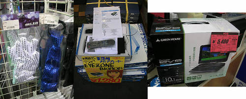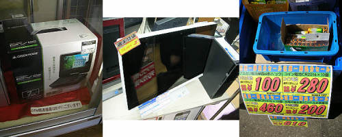 秋葉原他での巡回151011買い物中に気になったものです・・1.IO-DATAのフルHD対応24.1インチ液晶モニター、LCD-AD241XW・・ドット抜けやHDMI端子が無い等・・ですが通常税込み7800円の1000円引き・・黒と白があり・・(じゃんぱらBF)2.Raspberry Pi OSインストールマイクロSDカード(8GB)・・SDアダプターも付いているようです・・どういうものなのでしょう・・?税込み680円・・(じゃんぱら元コンビニ)3.レインポンチョ・・男女兼用フリーサイズ・・つばが透明ビニールで視界良好、裾のフックをカゴにかけるとめくれあがらないそうです・・税込み980円・・良いかも・・(PC-NETジャンク通り店)1.各社ネットminiPC・・ジャンクで何台か・・Atom330(1.60GHz)、税込み3980円やAtomD510)(1.66GHz)、税込み3480円・・ともに未チェック、MEM/HDD無し・・小さくて良さそうですが・・(PC-NETジャンク通り店)2.例のFujitsuのタブレット・・今度は箱入り(付属品不明)、9800円と本体+AC、7800円が一杯出てきました。1個ONすると起動していましたが、BT切れで各機能まではチェックできませんでした・・(マーシャルリアル店)3.PanaのD-VHSビデオカセットレコーダー、NV-DHE20・・通電のみ確認で980円・・D-VHSってどういう規格でしたっけ・・?(アールガーデン)1.タカコムのデジタルボイスレコーダー、VR-D170・・通話録音装置・・電話の録音装置のようです・・4980円・・しっかりした業務用・・?(アールガーデン)2.EPSONのミニPC、Endeavor NB51E・・AMDE2-1800(1.7GHz)/2GBMEM/250GBHDD/OS無/ACつき・・税抜き8800円・・どうでしょう・・?(U-SHOP2F)3.ライト付きシステム手帳セット・・どうなんでしょう?・・税抜き780円・・(U-SHOP2F)