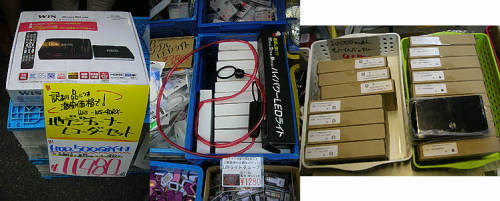 再度ジャンク道を南下・・途中曲がってキャプテンへ・・特に変わりません。芳林公園でおトイレ。マーシャルリアル2号店・・ここにも工学ジャンクPCがありますが・・それには目も触れず格安ジャンクへ・・12V/1.5AのACアダプターが100円だったので1個ゲット。その他HDDケースが色々出ていたので、物色し・・診断機能の付いているやつを1個ゲット。少し戻ってicon2・・特にありません。ジャンク道に戻り、あきばお~八号店・・無し。曲がってicon・・miniDVのビデオカメラ色々、1500円。ほかにSANYOのXacti用のBTが300円。その他周辺無し。再度ジャンク道に戻り南下。インバース・・特にありません。インバース2・GFTOP・・も無し。九十九アウトレット・・ありません。さらに南下・・オレンジ前露店・・まだ準備中・・16インチのポータブルDVDプレーヤーがジャンクで500円。7インチのものが200円・・どちらも電源も入らないよ・・とのこと。面白そうですがスルー。 三月兎三号店・・無し。秋葉原ハードオフ・・SONYのオープンリールデッキ・・無くなっています。売れたのでしょうか・・?SONYのHDD/DVDレコーダーも無し。NikonのS8・・BT入りで税込み540円・・BT少し生きていて起動はしていました。その他リモコン等変わりなし。ドスパラパーツ館・・3F上海問屋・・特にありません。2F中古フロア・・も無し。おトイレ後反対に出て、アールモバイル・・特にありません。あきばお~二店・・特になし、さらに回ってジャンク道に出て、GENO・・無し。まんだらけを見つつあきばお~零号店・・ジャンクコンテナ出ていますが・・特に無し。明神通りを渡ってジャングル本店・・SONYのブルーレイレコーダーが税抜き13800円。他は特に無し。 回ってマルツ電気?・・ミニポンプ、電子秤・・ともに売れたようです。他は特に変わりなし。イオシス路地裏店・・PC-NETにあったNECの太っちょミニPC・・具つき・OSつきで7980円。千石電商・・特に無し。回ってあきばお~弐号店・・ネットワークカメラ、税抜き8200円。良さそうな感じです。・変わらず。パレックス・・100円処分市にワンセグ-F端子アダプター発見、ゲット。500円ナップザックなどはなくなっていました。ジャングル三号店・・またGP02がジャンクで出ていましたが・・税抜き1500円とお高い・・。CASIOのコンデジ1000万画素・・充電器・BT付きで税抜き1000円セール・・これは安いのでは・・?ショーケースに入っていて見にくいのでわかりにくい・・。 引き続き買った物をアップします・・