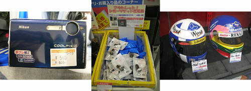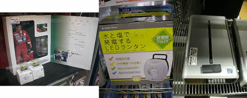 ※本日は小学校の同窓会のためお休みです・・明日元気なら出動予定です。 秋葉原他での巡回151017(1011)買い物中に気になったものです・・1.こちらはセナのヘルメットのレプリカ他・・懐かしいですねぇ・・あの事故がなければどこまで勝ち続けたことか・・シューマッハといい、天才ドライバーはどこかで悲劇が・・(まんだらけ)2.グリーンハウスの「水と塩で発電するLEDランタン」・・海水で発電できるということらしい・・税抜き3380円・・(15.10.11:セルスターR)3.CANONのモバイルプリンター、iP100・・通電確認済みとのことですが、税込み9999円とお高い・・(15.10.11:PC-NETジャンク通り店)1.「大人の科学マガジン」・・付録のVツイン蒸気エンジンが面白そう・・税抜き1500円はちょっと痛いですが・・(15.10.11:U-SHOP1F)2.スマホ・PC両対応USBカードリーダー、絆(SD-CRMMA)・・両サイドが通常のUSBとMicroUSBとになっている・・MicroSDXC64GB対応だそうです・・500円とちょっとお高め・・(15.10.11:千石電商)3.カバン類が最終特価で500円・・コロ付きのナップザックがちょっと小さいけどお勧め・・今週にはほとんどなくなっていました・・(15.10.11:パレックス)1.Wiiの箱入り・・付属品の違い?で1200円と1500円・・箱なしが1000円・・これらも今週はほとんどなしだったかと・・(15.10.11:ジャングル三号店)2.KENKOのハンディスキャナー、KS-H mini・・未チェック保証無しですが・・税込み1980円・・WORD・EXCELテキストファイルに変換できるOCRソフト付き・・(15.10.11:遠いじゃんぱら)3.SANDISKの128GBSSD・・税込み6880円・・この時点では安いと思いましたが・・先週じゃんぱらでセールで5000円を切ったとか・・?(15.10.11:PC-NET)